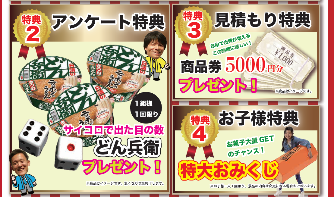 無料でもらえる「豪華な特典」や楽しい「体験イベント」、お家のお悩み「なんでも相談会」も準備しておりますので、ぜひお立ち寄りください。
