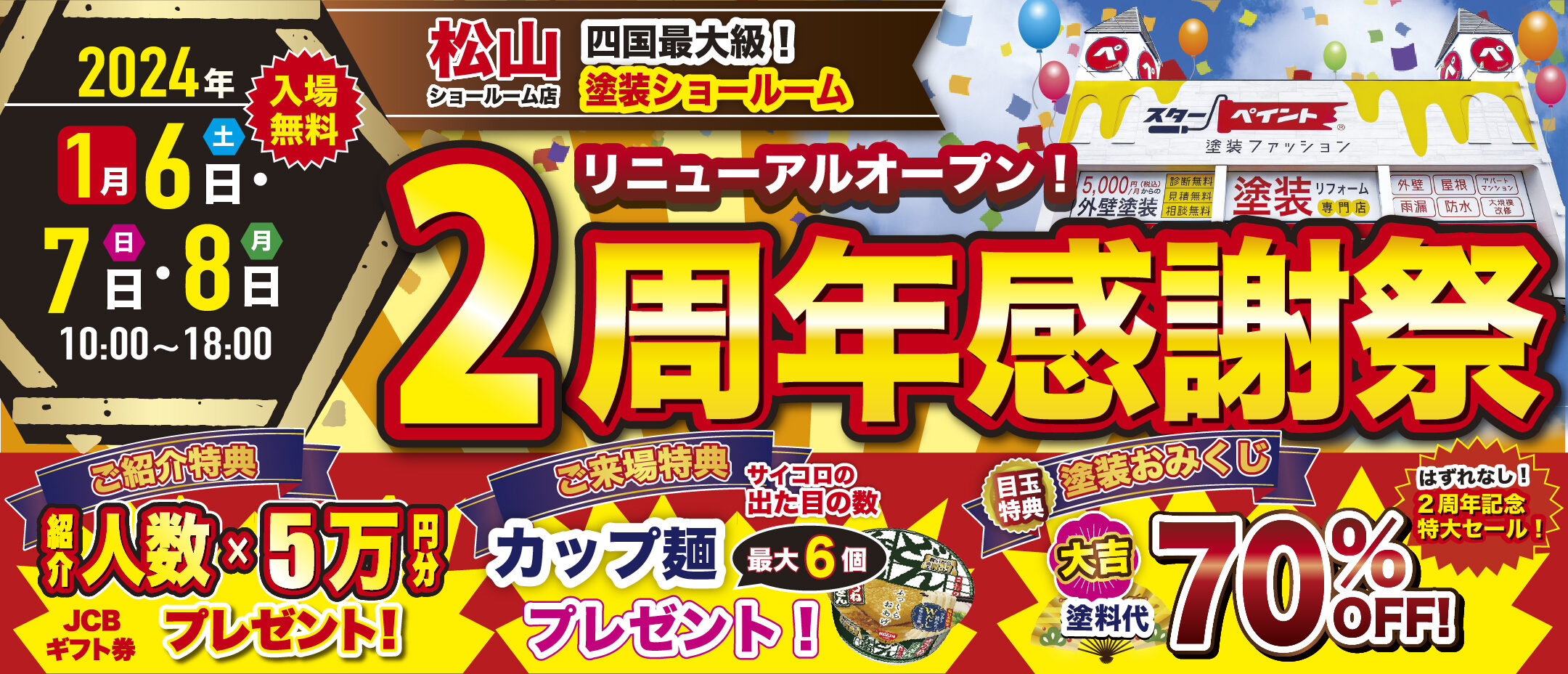 | 開催地 | スターペイント松山ショールーム店 敷地内に十分な駐車スペースがございます。 |