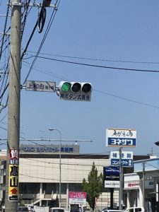交差点の向こう、、右側にメガネのヨネザワさん、左側に北キツネの大好物さんの看板が見えます。