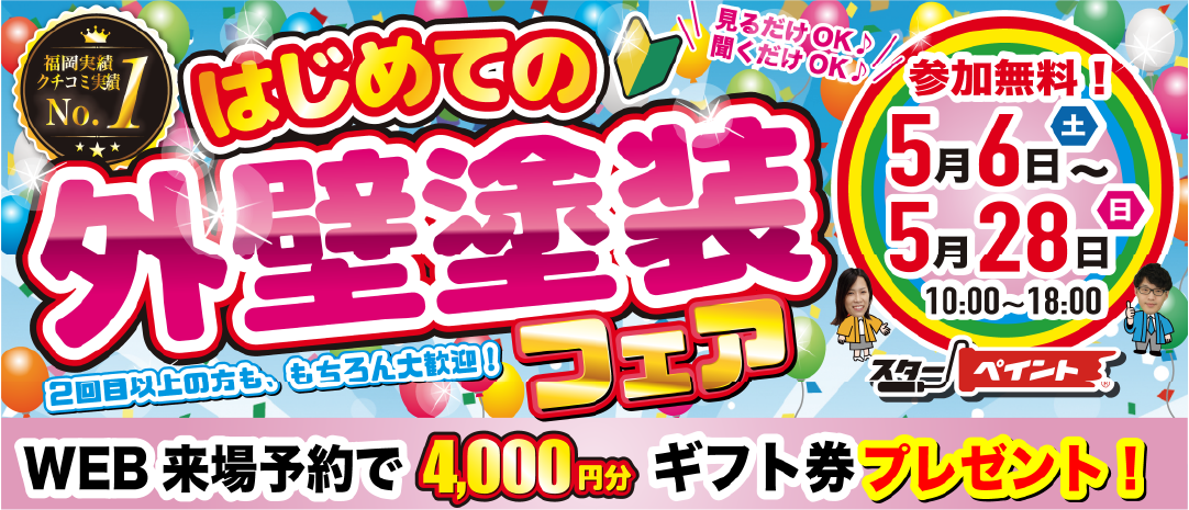 【はじめての?外壁塗装フェア】来店予約はこちらから!福岡で塗装実績No1スターペイント