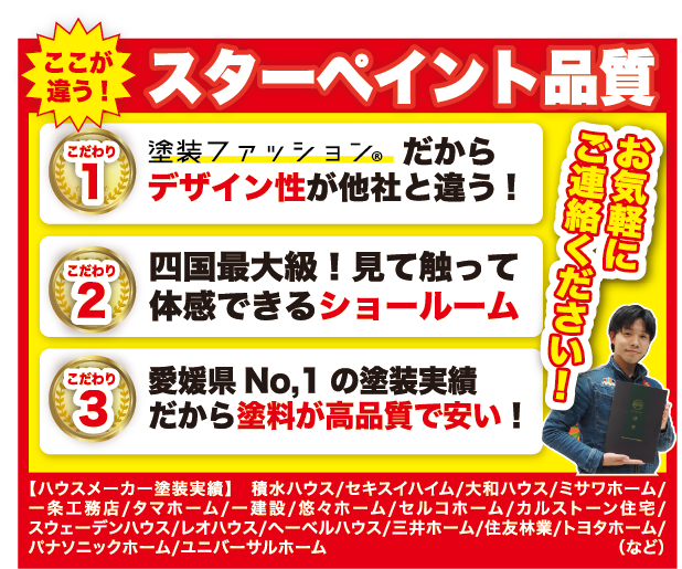 スターペイント松山ショールーム店は愛媛県で施工実績No1!の外壁塗装・屋根塗装・防水専門店です。