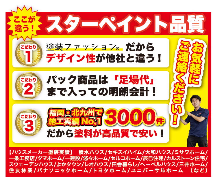 スターペイントは福岡・北九州で施工実績No1!の外壁塗装・屋根塗装・防水専門店です。ハウスメーカーの塗装実績も多数ございます、