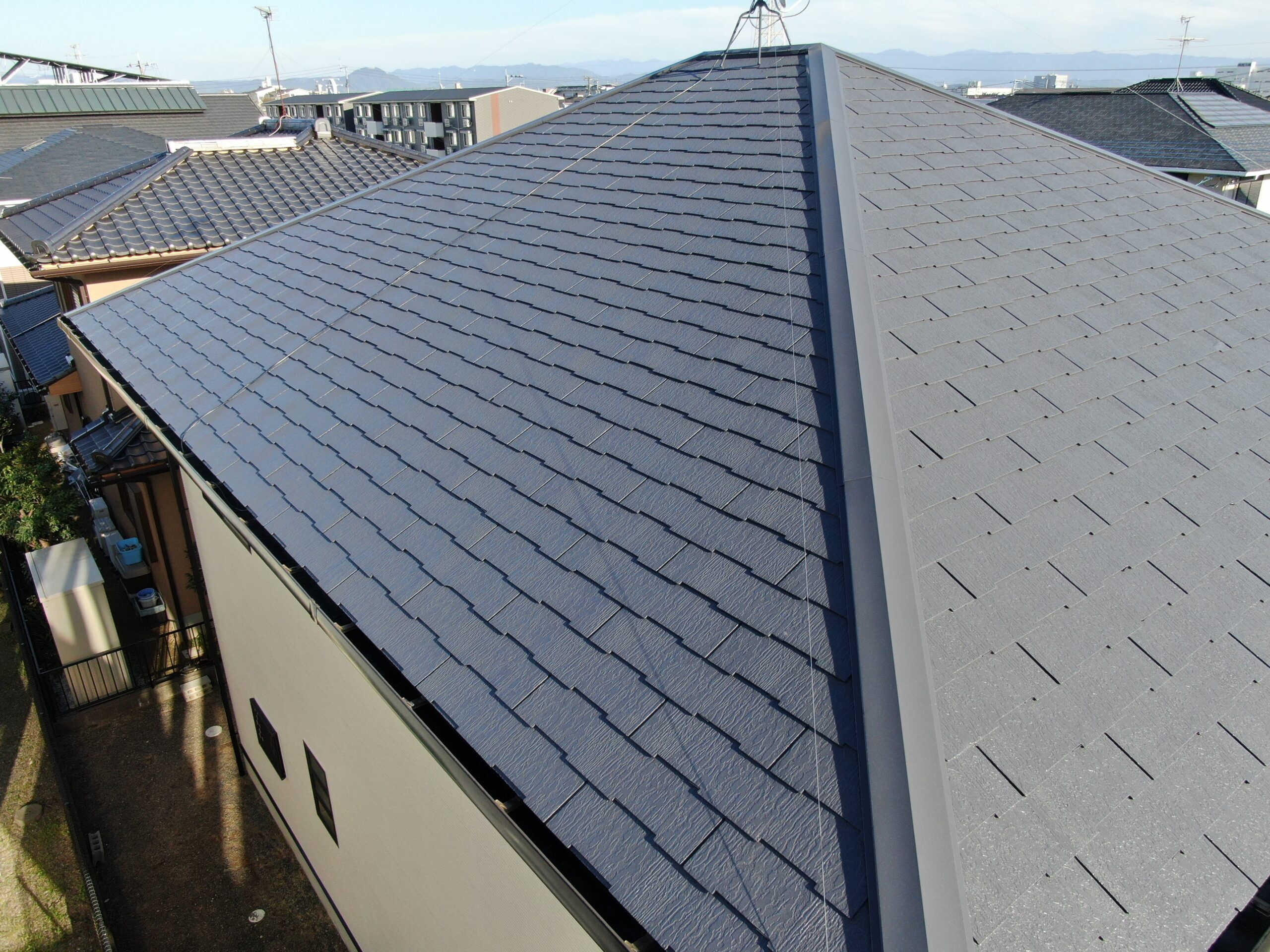 ほとんどの色の外壁と相性が良く、合わせやすいのがグレーです。 グレーは“無彩色”といい黒と白のみで構成された色のため、色味が入っていないので、他の外壁や周りの色から浮いてしまうことがありません。屋根のみ塗装される方にもとても人気のある色です。 また、黒色以上に汚れなどが目立ちにくいカラーとされています。