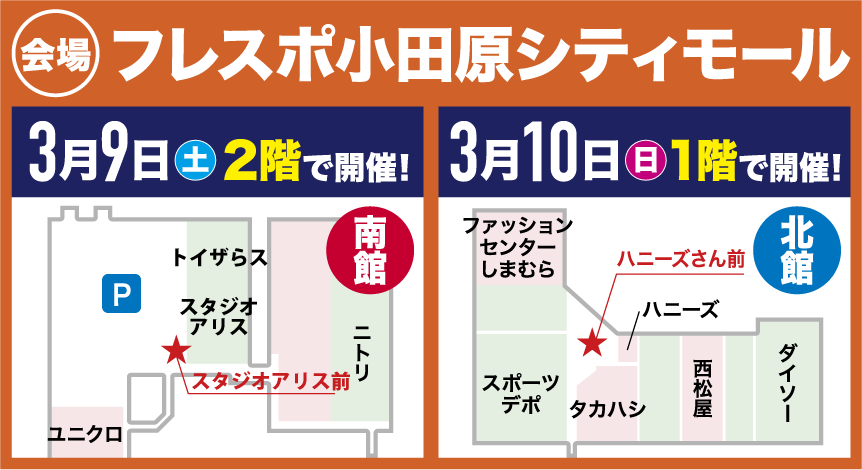 〒256-0813 9日(土) 南館2F スタジオアリス前 10日(日) 北館1F ハニーズ前 |
