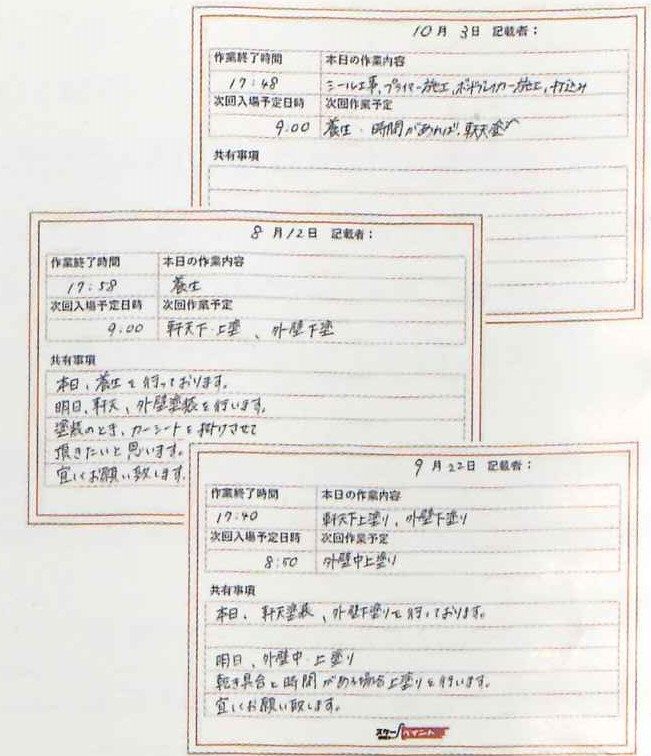 その日どのような作業を行ったのか、明日どのような作業に入るのか、お知らせすべき点などを現場の担当職人が毎日書き込みお渡ししております。