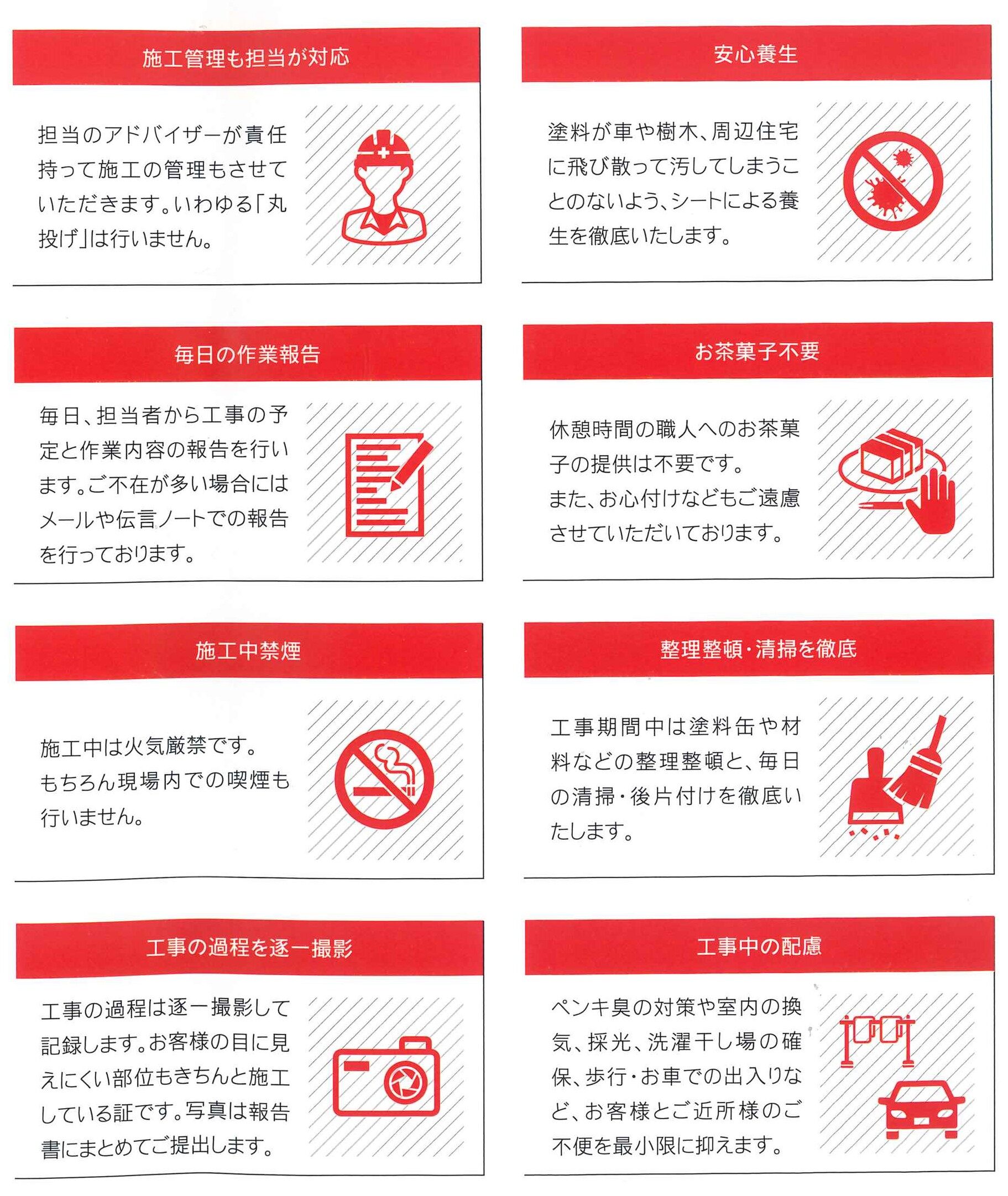 私たちは工事中もお客様に気持ち良くお過ごしいただくために、お約束いたします!