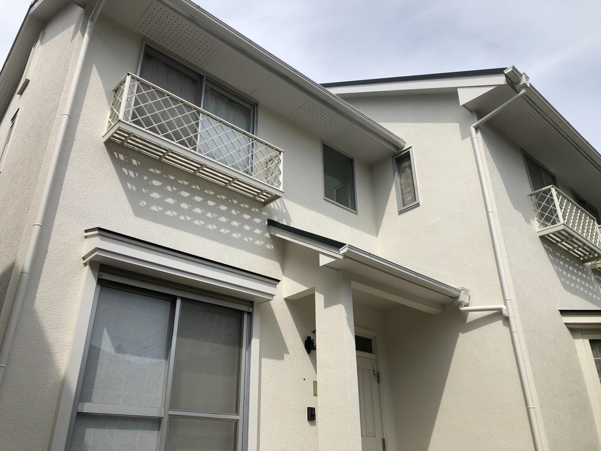 白いモルタル外壁のお家は白色でまとめてみました。サッシ・外壁ともに白いため、合わせて 白で統一することで、爽やかで清潔感のある品のあるお家になりました。 ■グレー サッシの色と合わせた場合 雨樋を初め、シャッターもグレーですので、このように付帯部全体で同じ色にしておくと違和感なく馴染んで統一感があり締まります。