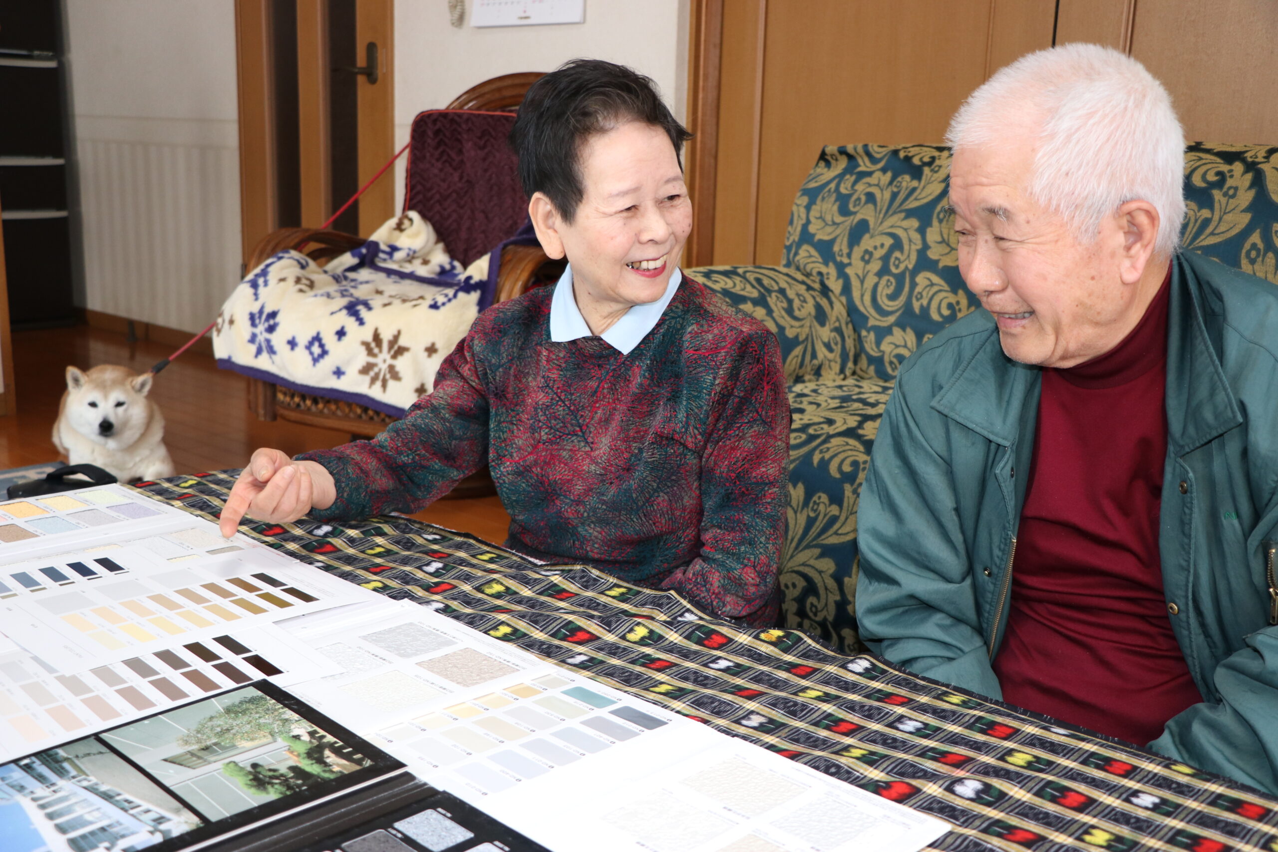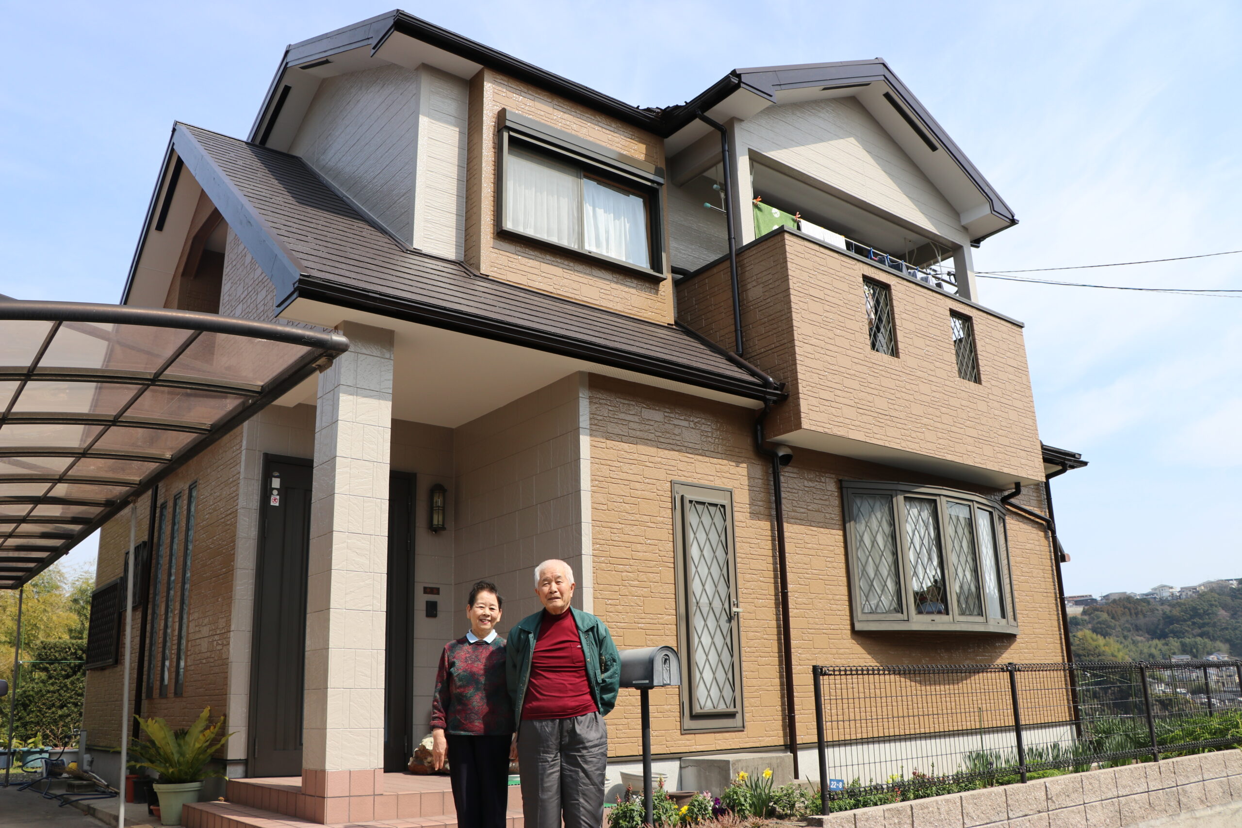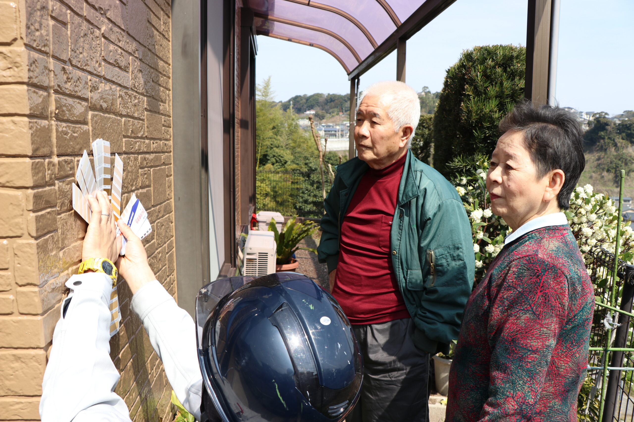 色決めの時も、既存のレンガ調の雰囲気を活かした落ち着いたベージュ系を希望していると伝えると、たくさんの見本を見せながら『この色は光が当たるとこう見えますよ』と的確なアドバイスをくれて、夫婦で楽しみながら選ぶことができました。