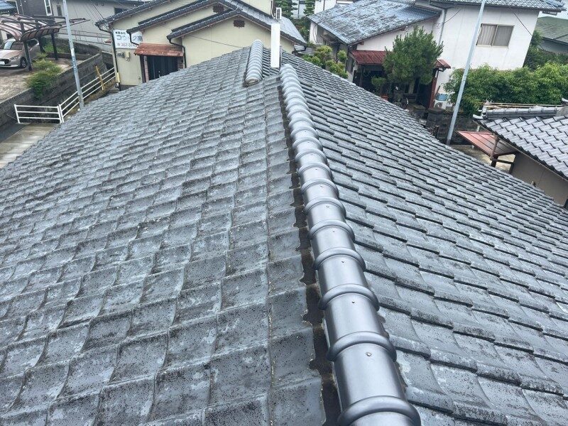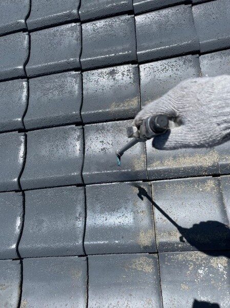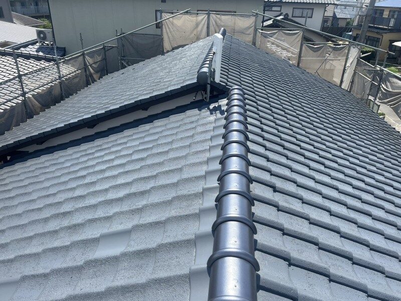 棟瓦は強化棟施工がされております。また陶器瓦のため塗装ができませんので養生を行い作業を進めていきました。