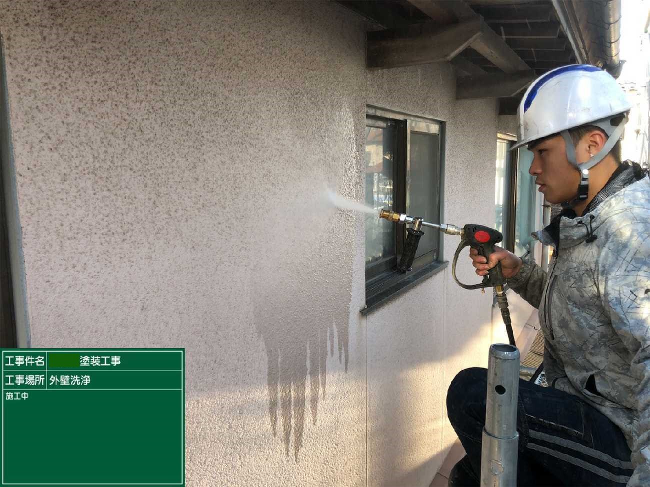外壁の洗浄を行っている様子です。 高圧洗浄機で汚れをくまなく落としていきます。