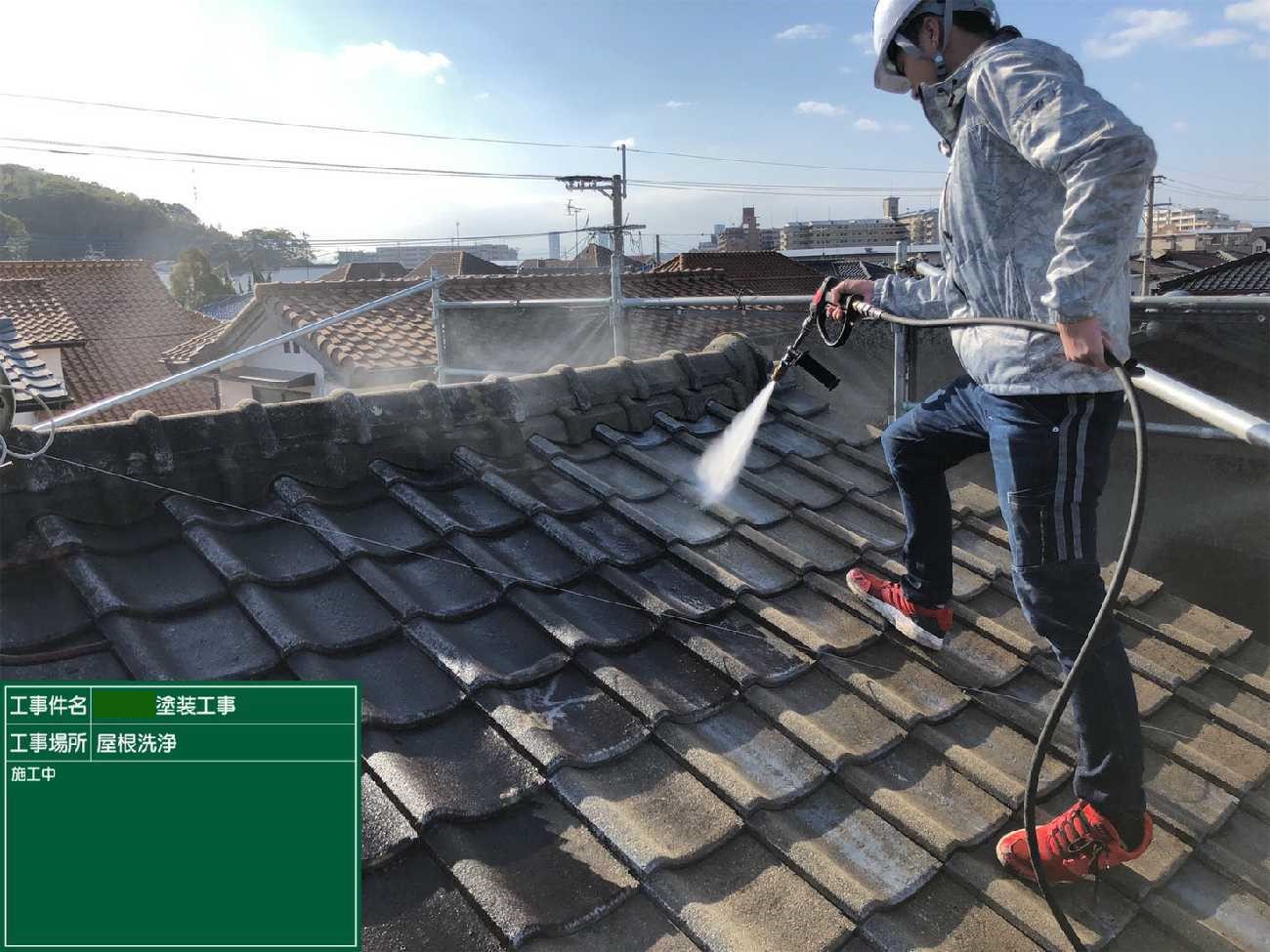 屋根も同じように洗浄していきます。 コケなどが発生してしまいますのでしっかり落とし塗料が着くようにします。