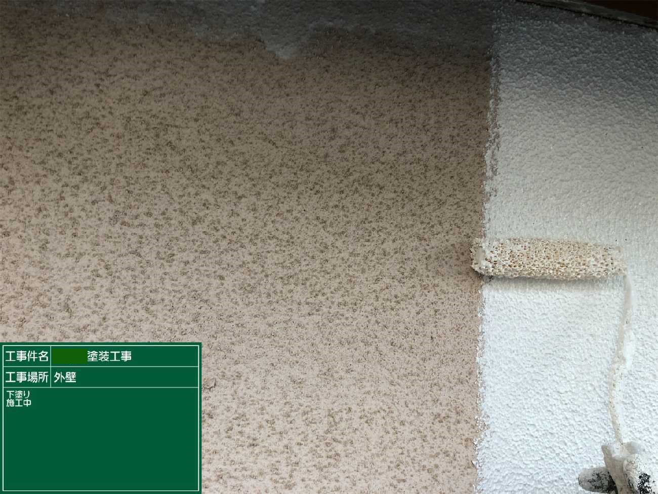 外壁から塗装のご紹介致します。 先ずは下塗り塗装の様子です。下塗りで密着性を高め塗料が下地と着くような役割を担っています。