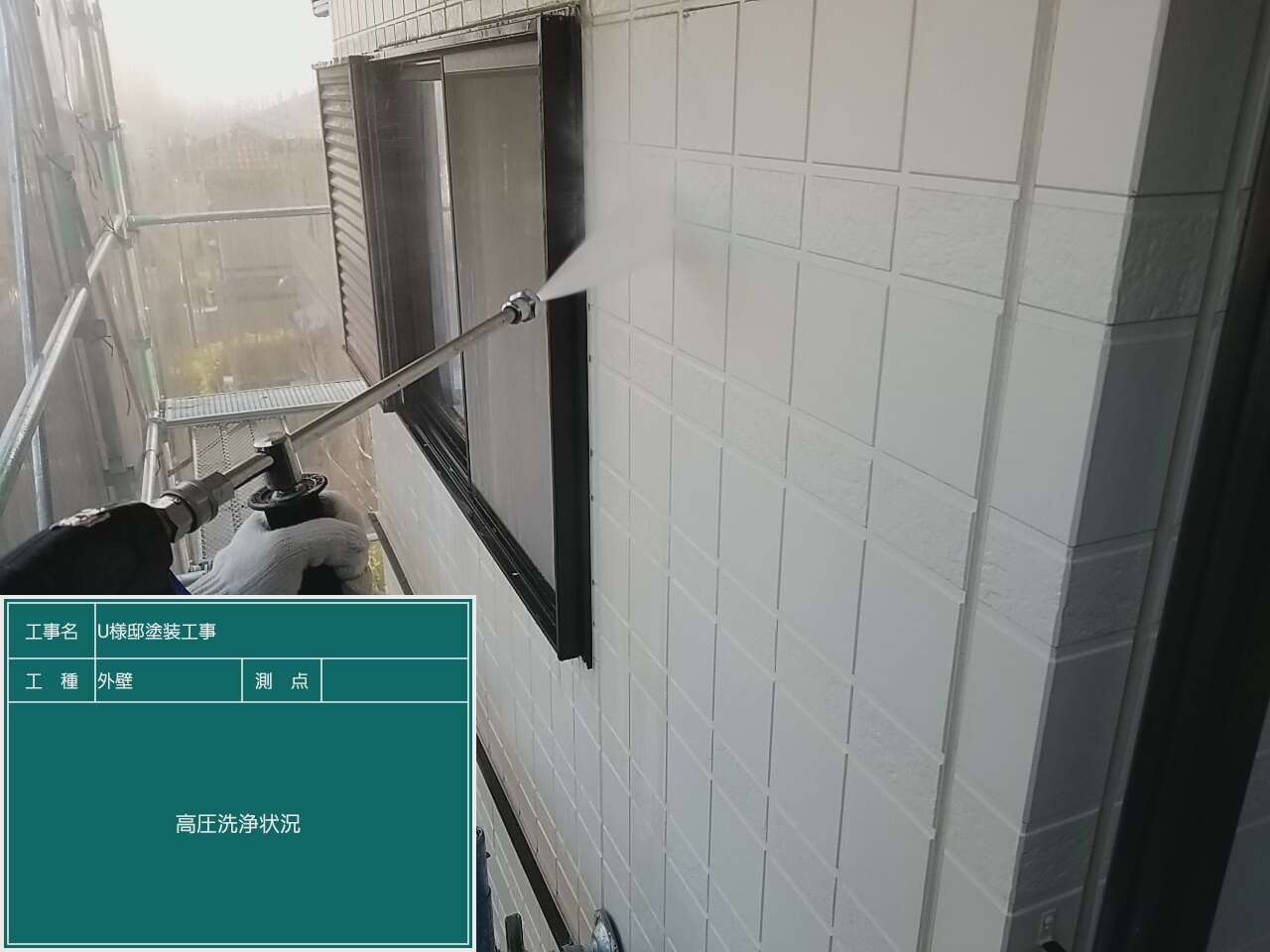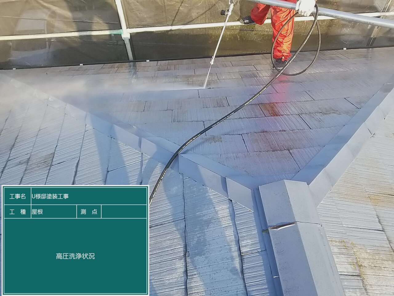 塗装作業前に入る前に、高圧洗浄で藻や苔を綺麗に洗い流していきます。