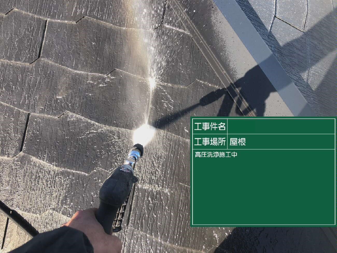 屋根の高圧洗浄作業の様子です。