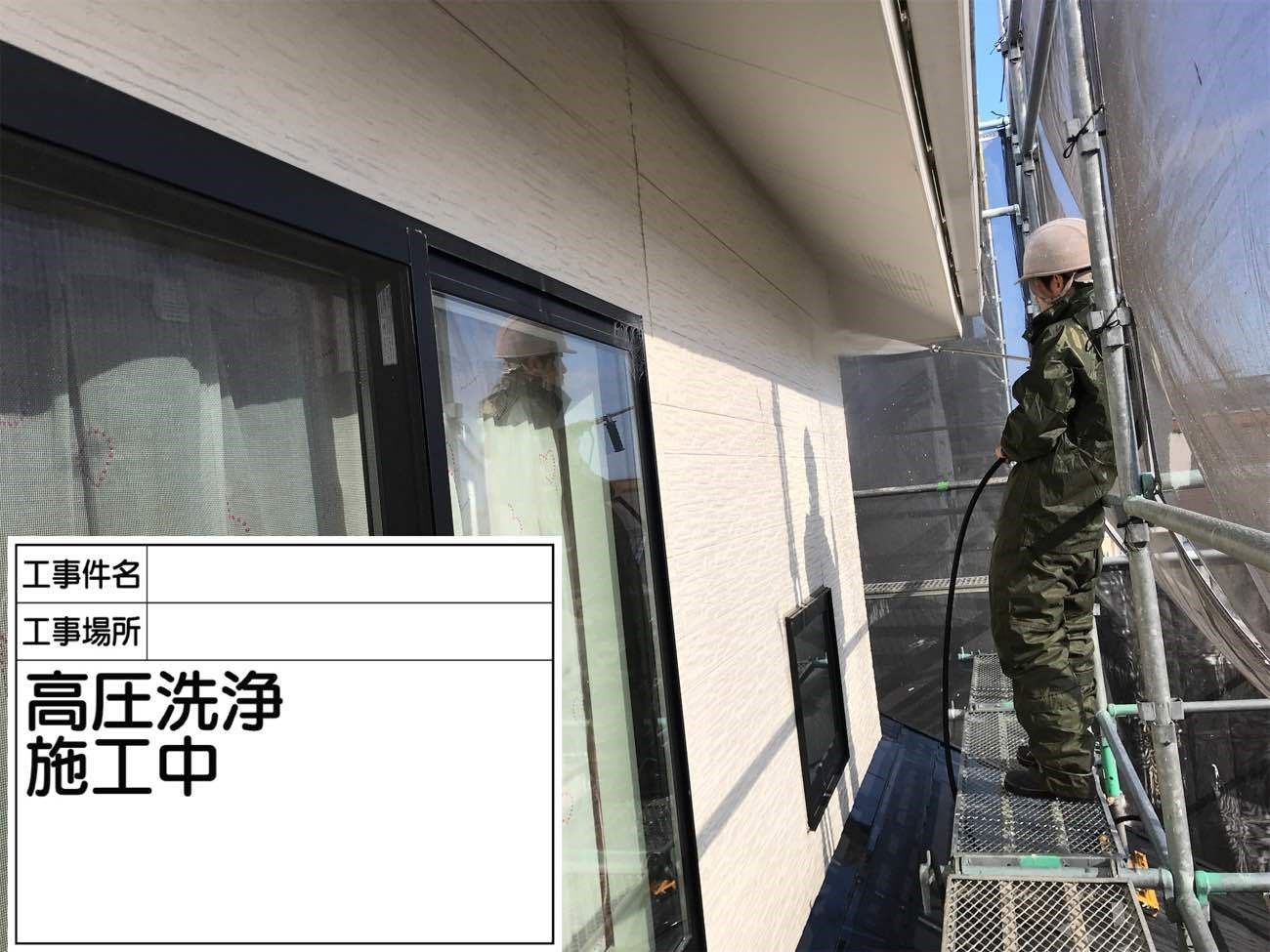 外壁の高圧洗浄中の様子です。