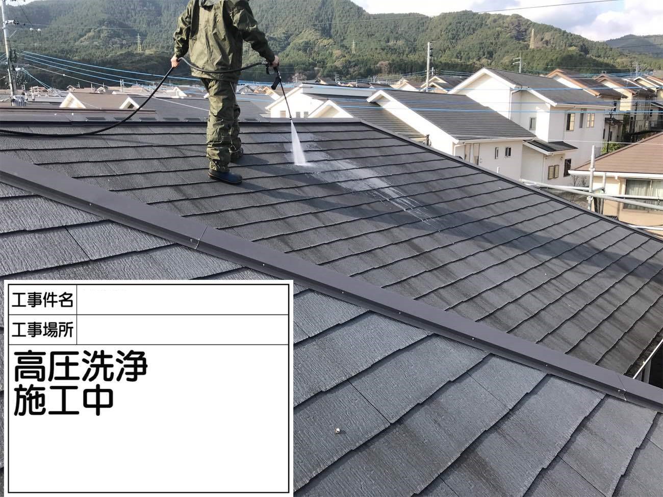 外壁同様、屋根も高圧洗浄機で洗浄していきます。