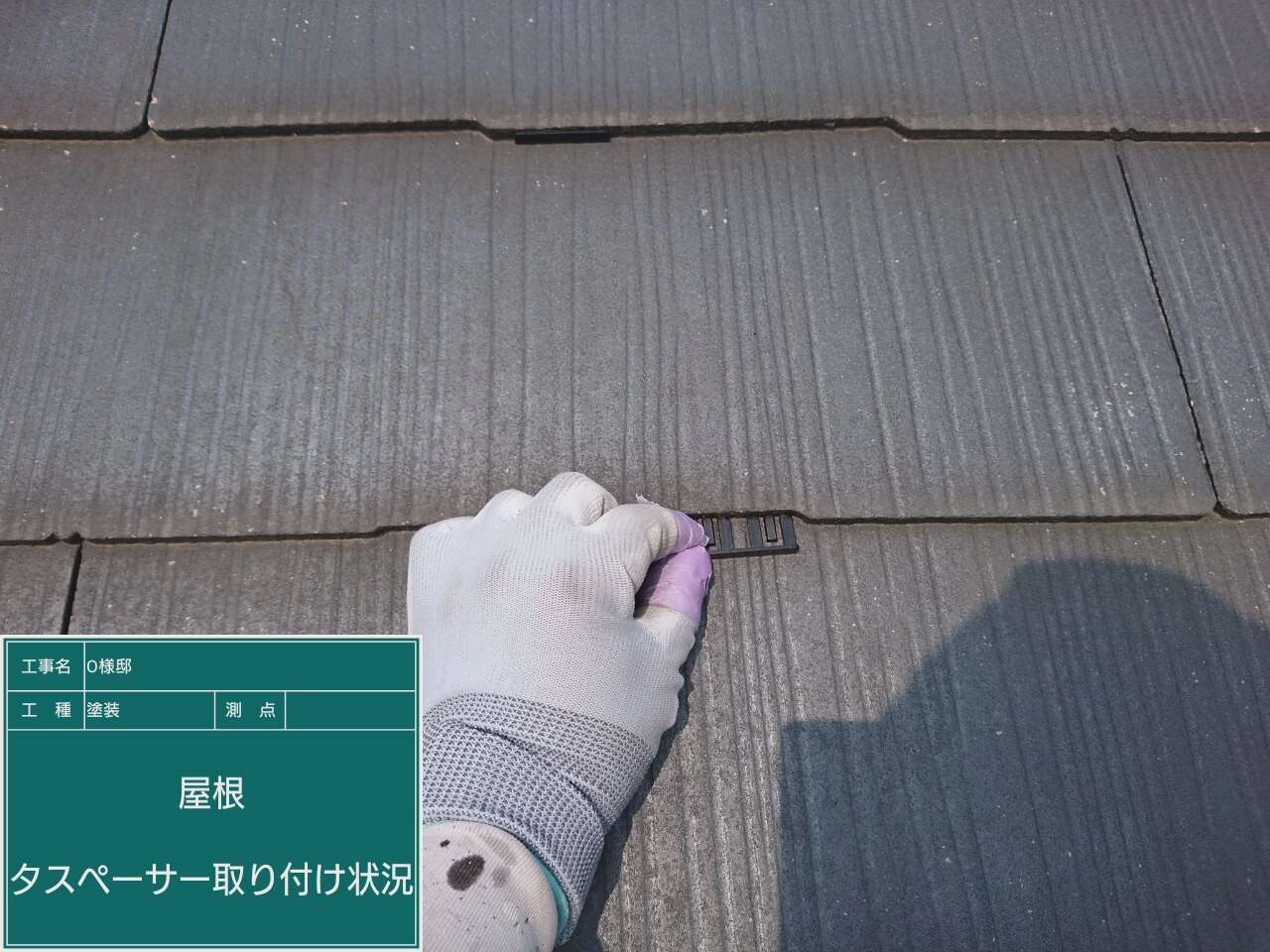 タスペーサーの取り付けは意外と重労働です。指先に養生テープを巻いているのは、ケガをしない為の職人の知恵です。
