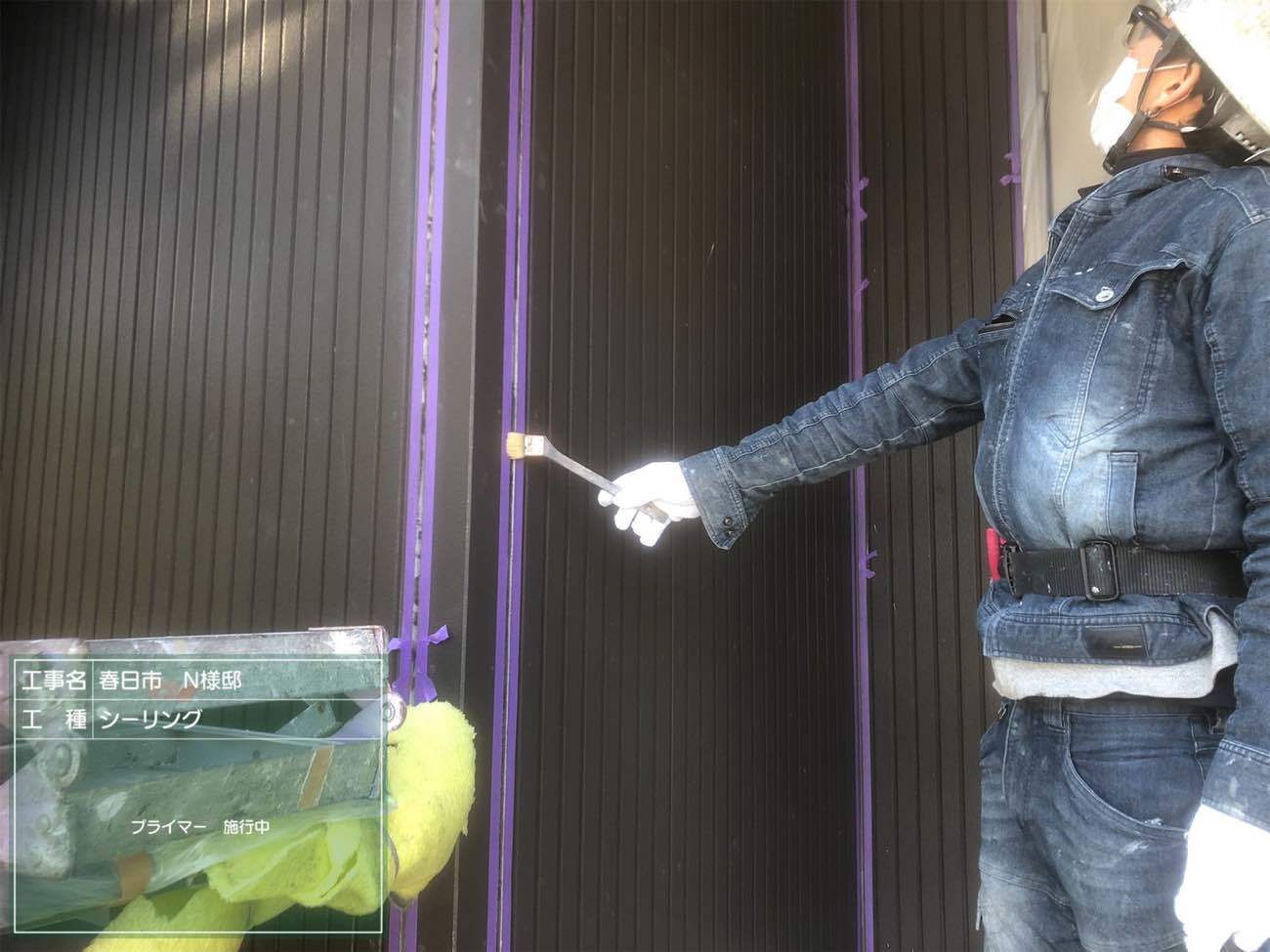 シーリング工事のプライマーは底面ではなく側面に塗るのがポイント。職人さん、どうやら写真に写るのが照れ臭いようです。ばっちり写ってますよ!