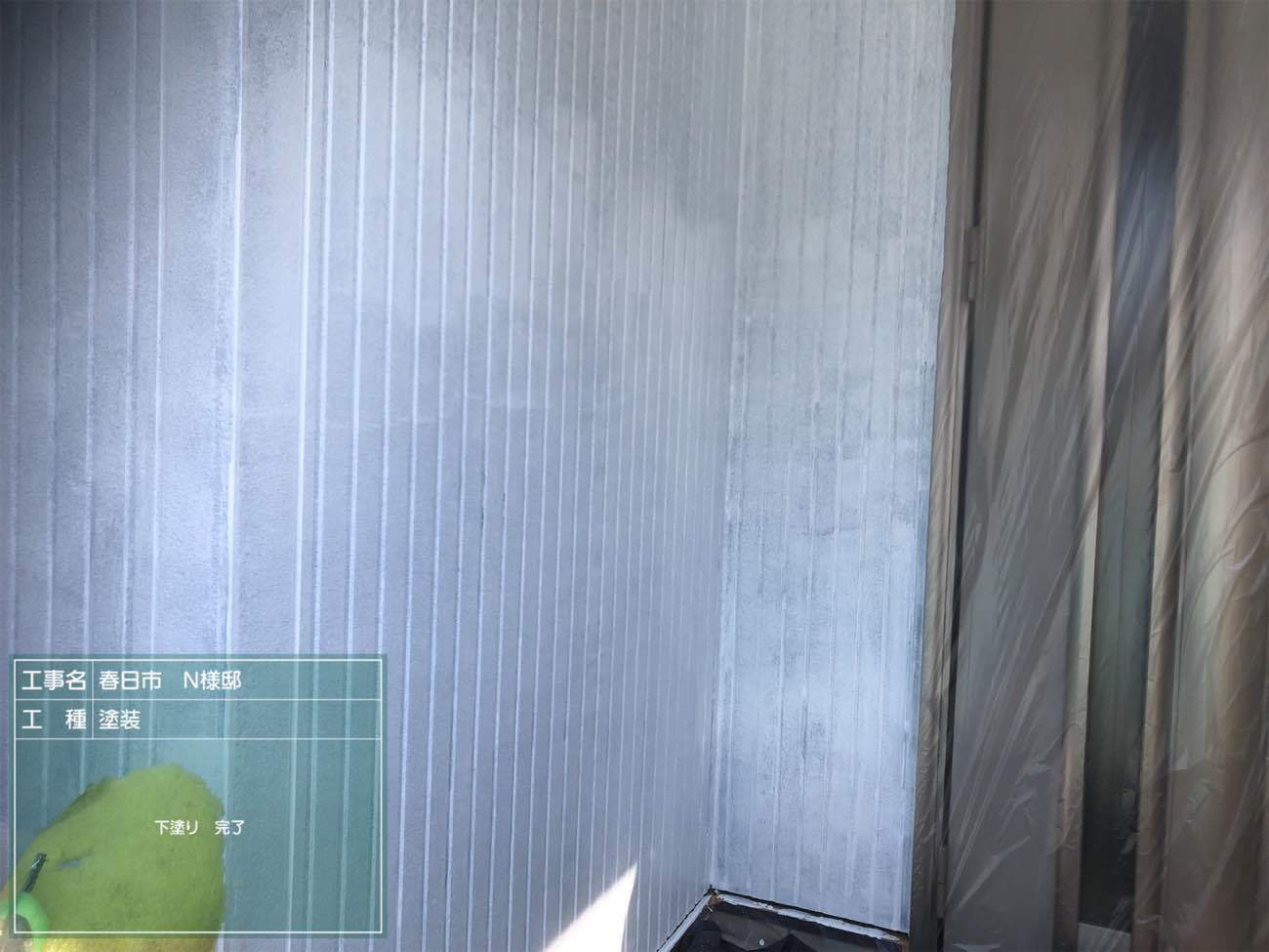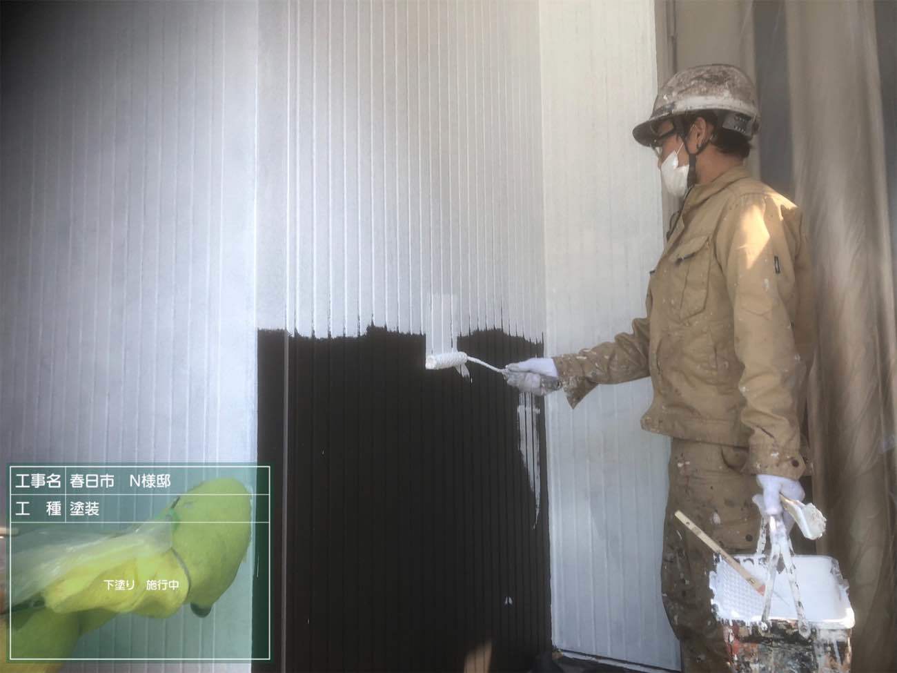 外壁の下塗り工程です。白い下塗り塗料を塗ることで塗料の密着性を高め、発色を良くします。