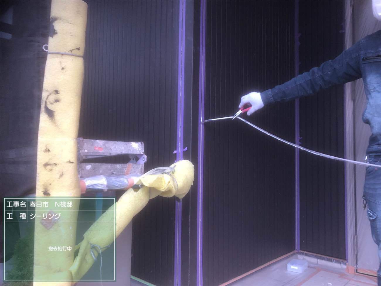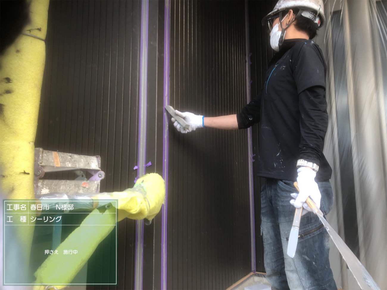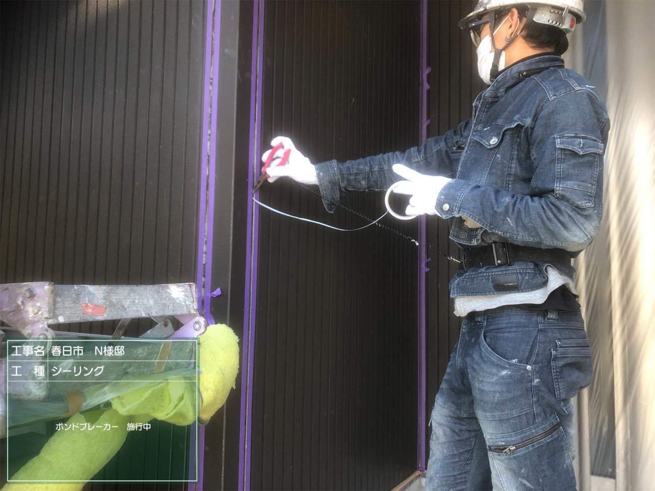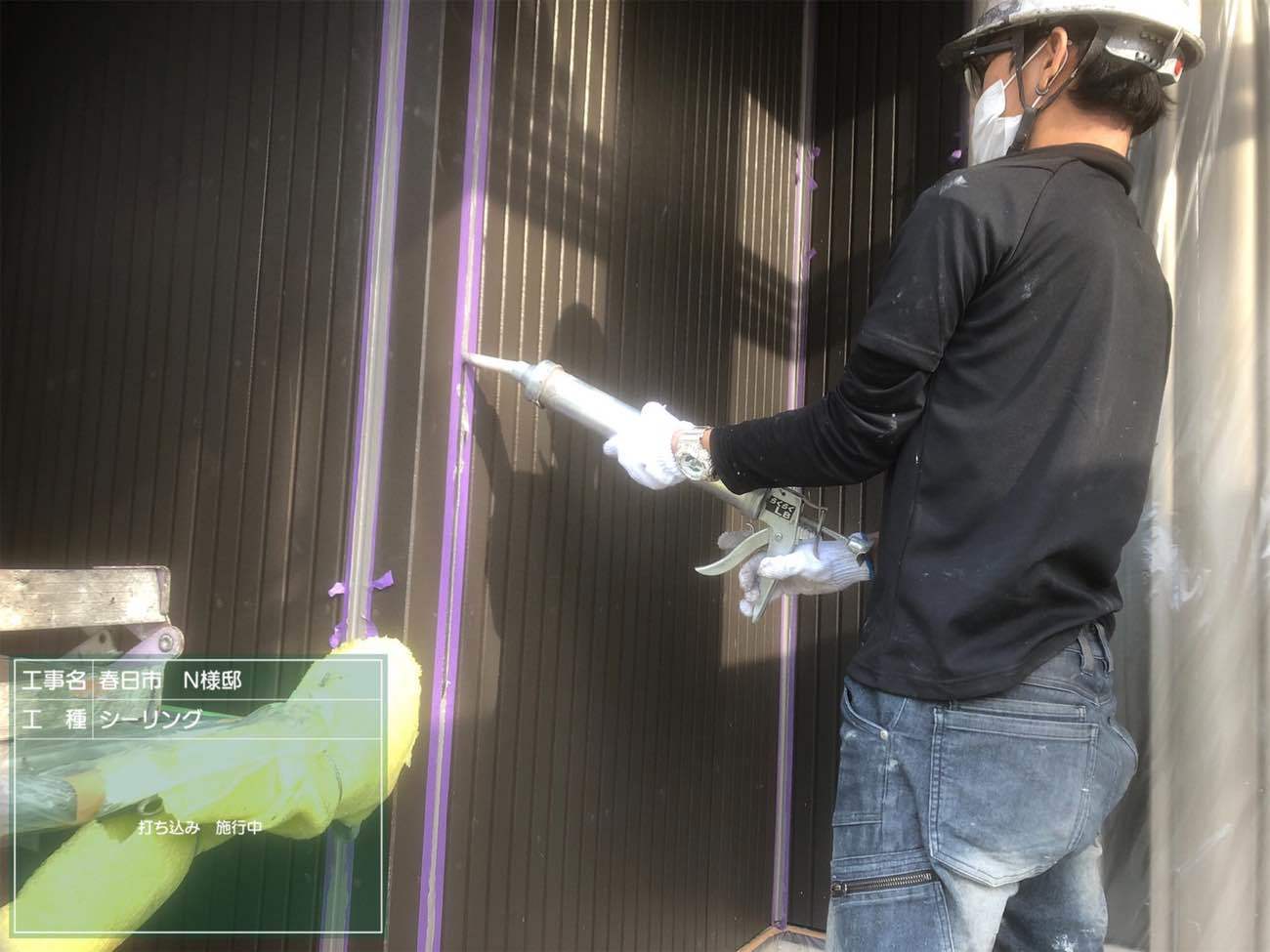 ボンドブレーカー施工。ボンドブレーカーはシーリングの割れを防止するために重要。詳しくは『スターペイント ボンドブレーカー』で検索。
