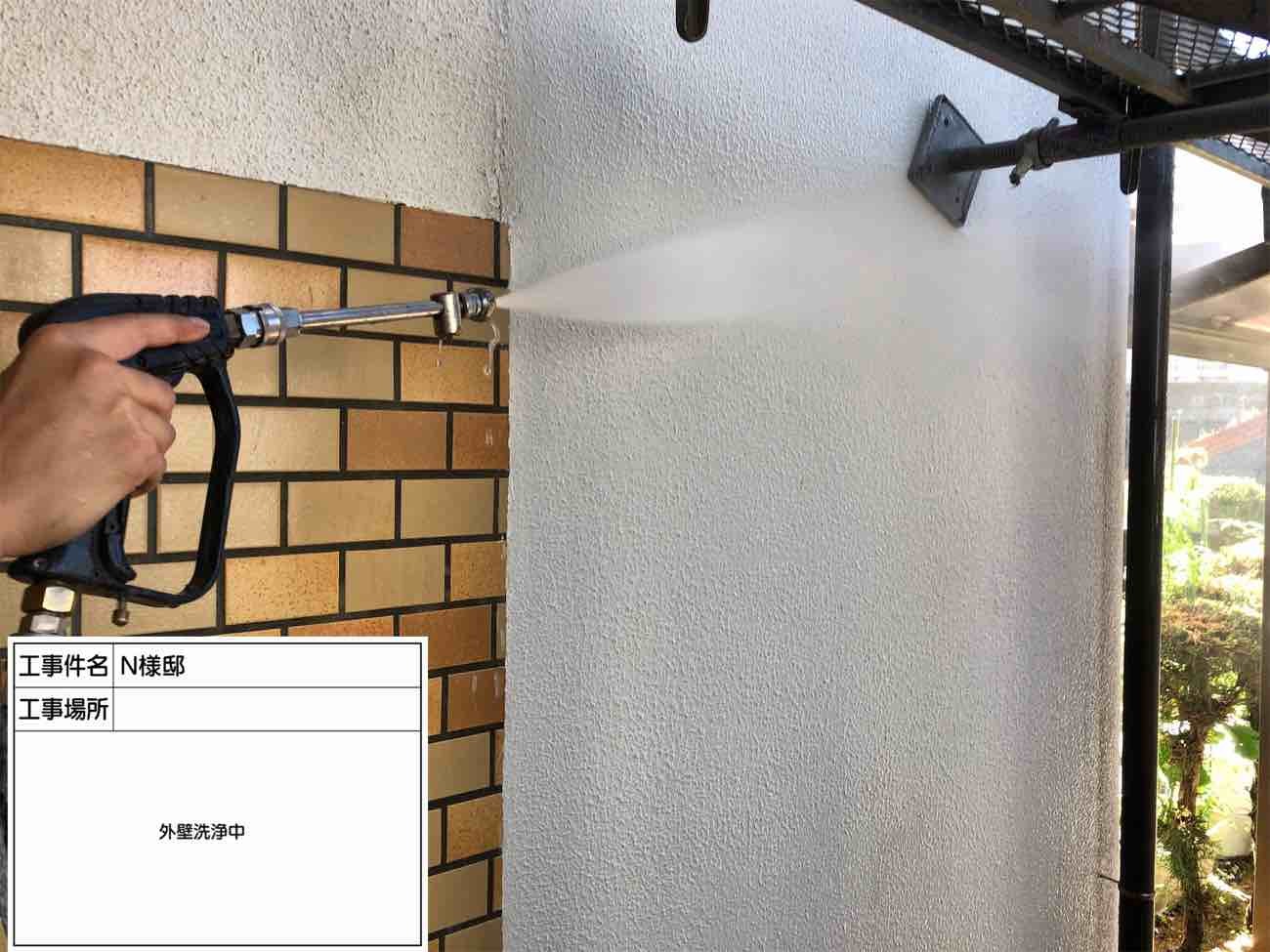 強力な高圧洗浄機を使用して、汚れや古い塗膜を洗い流していきます。 しっかり洗浄を行うことは、塗膜を長持ちさせるためにも重要です。