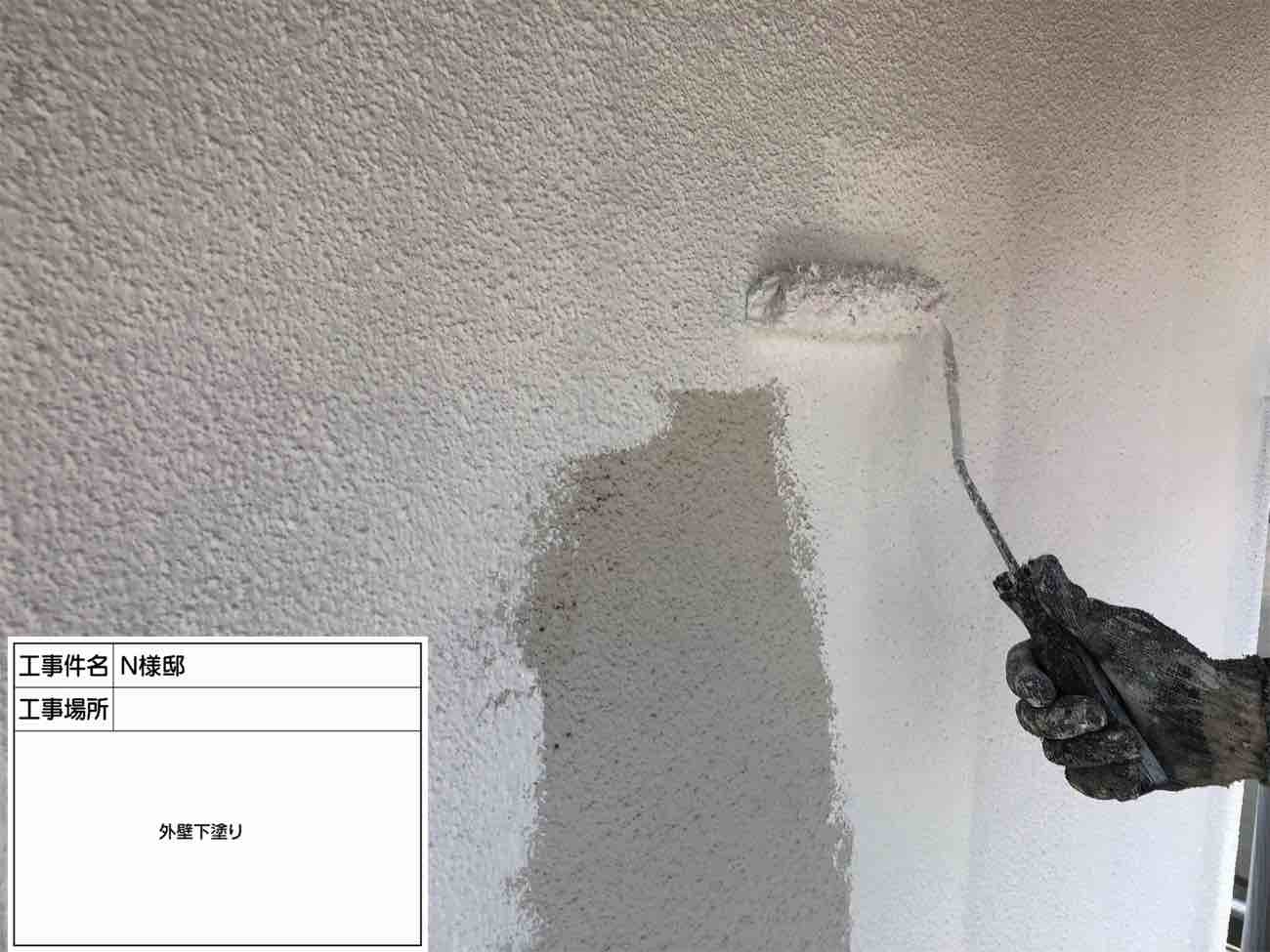 いよいよ塗装作業に入ります。 下塗りは接着剤のような役割があり、下地と塗料を密着させ長持ちさせます。 塗装工事の中でも最も重要な工程ともいわれます。