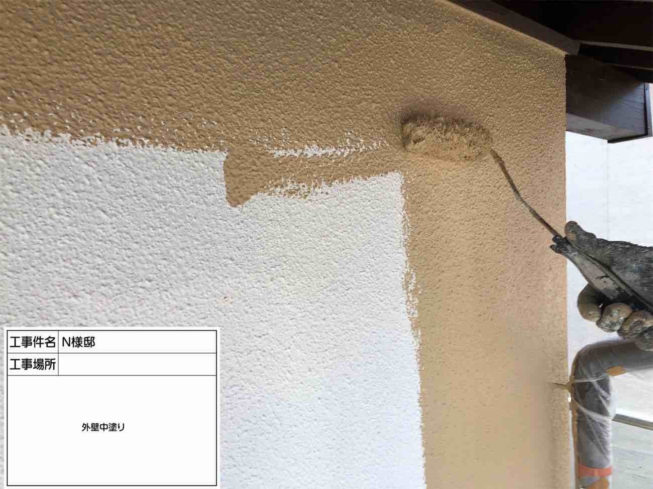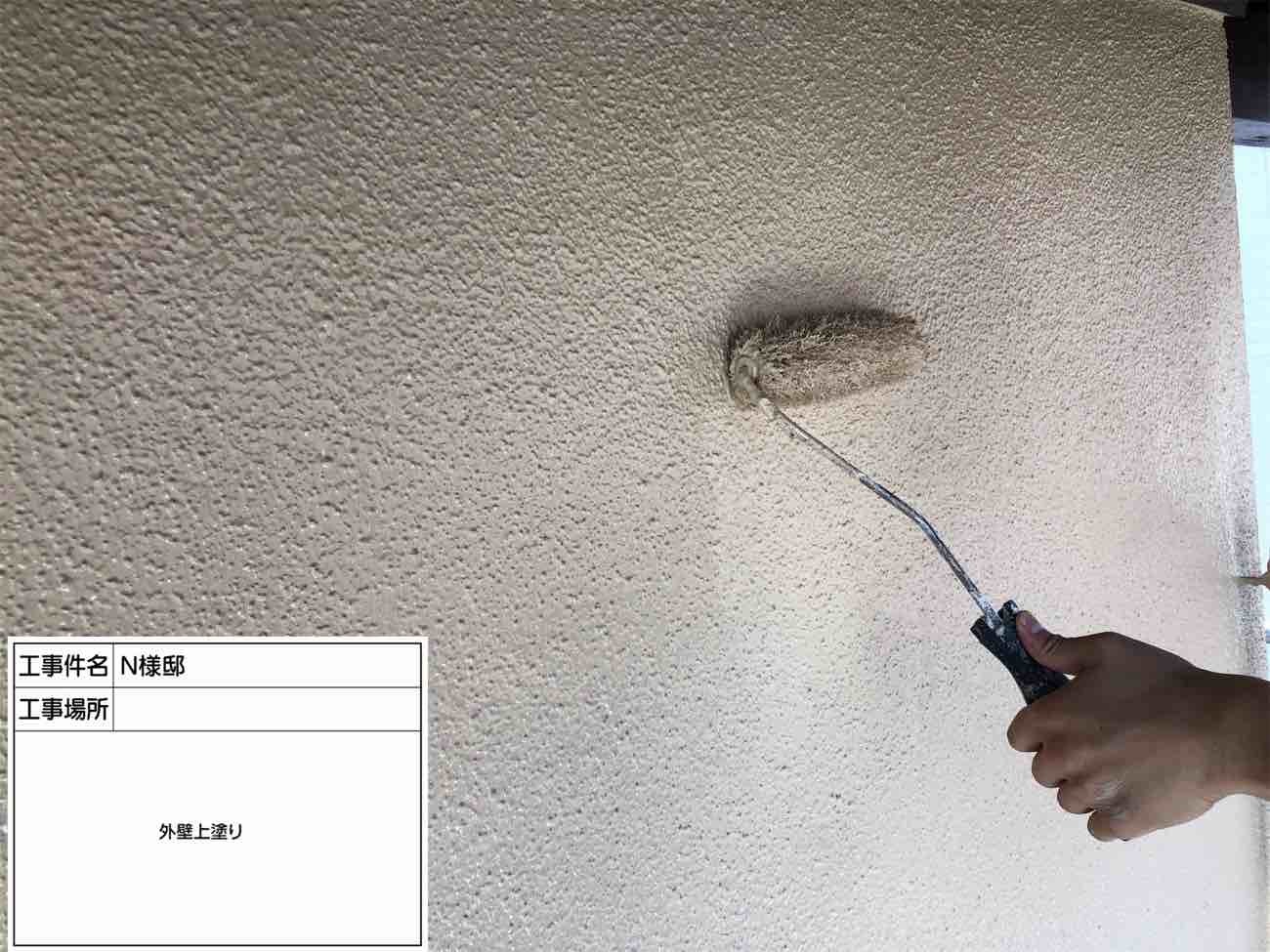 外壁塗装の仕上げにあたる上塗り作業です。 美観と耐候性などに関わる大切な工程です。