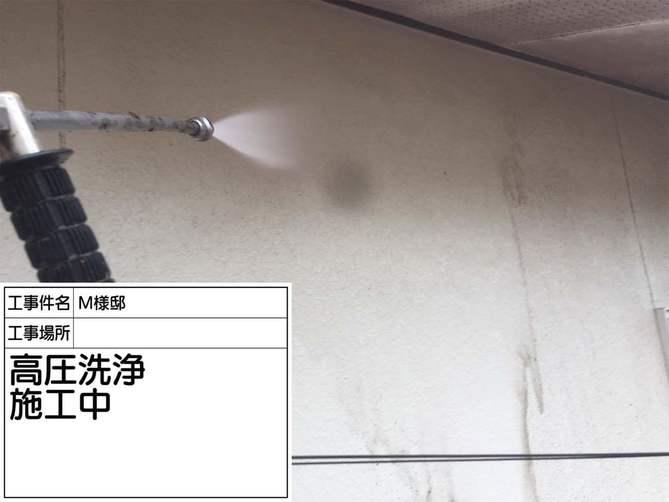 外壁の洗浄を行っている様子です。 高圧洗浄機で汚れをくまなく洗い流します。