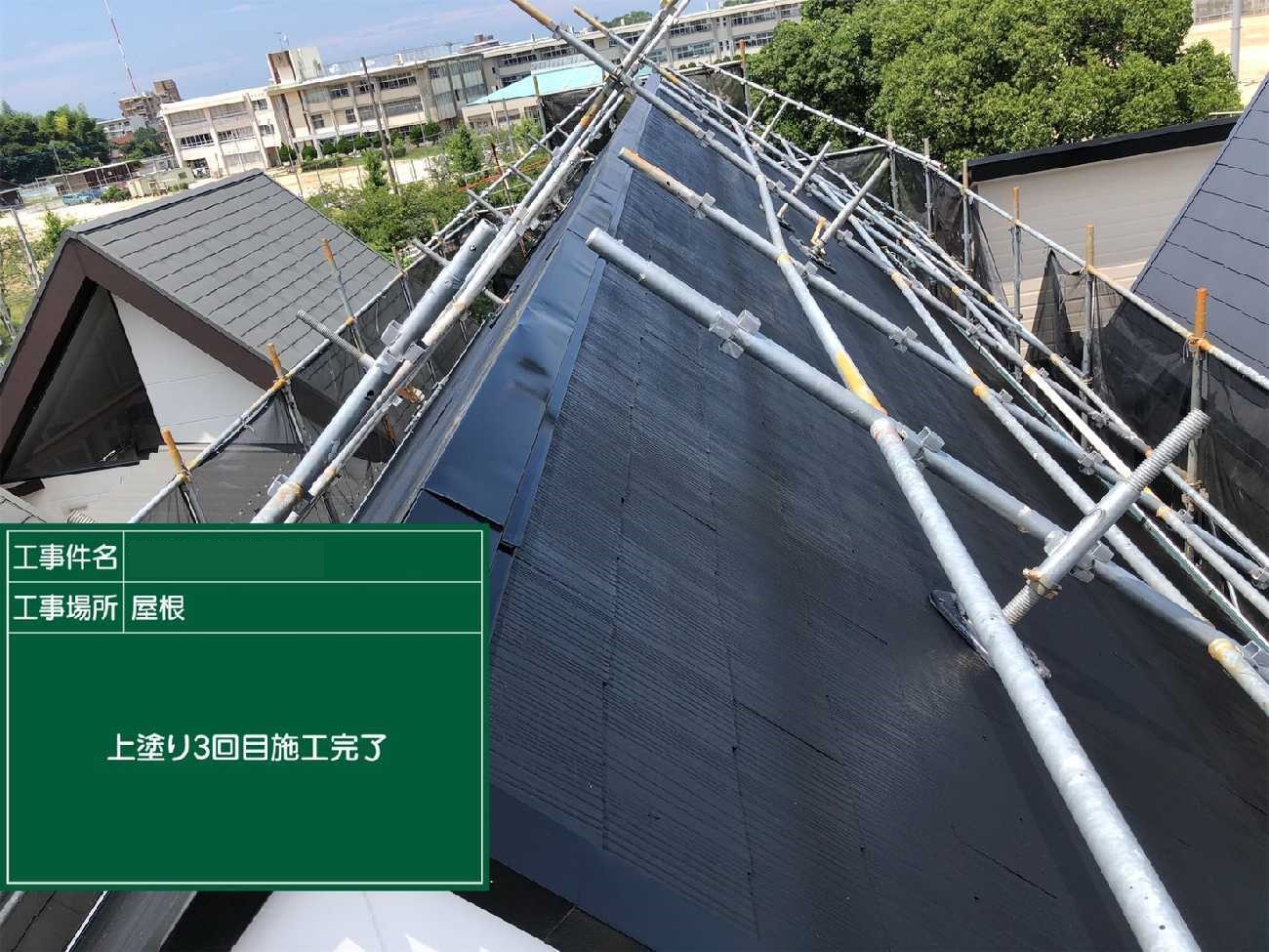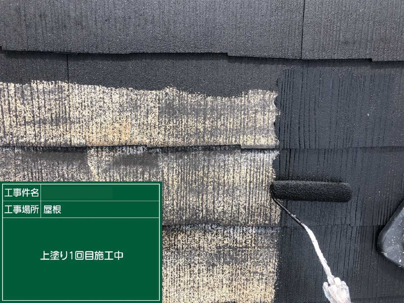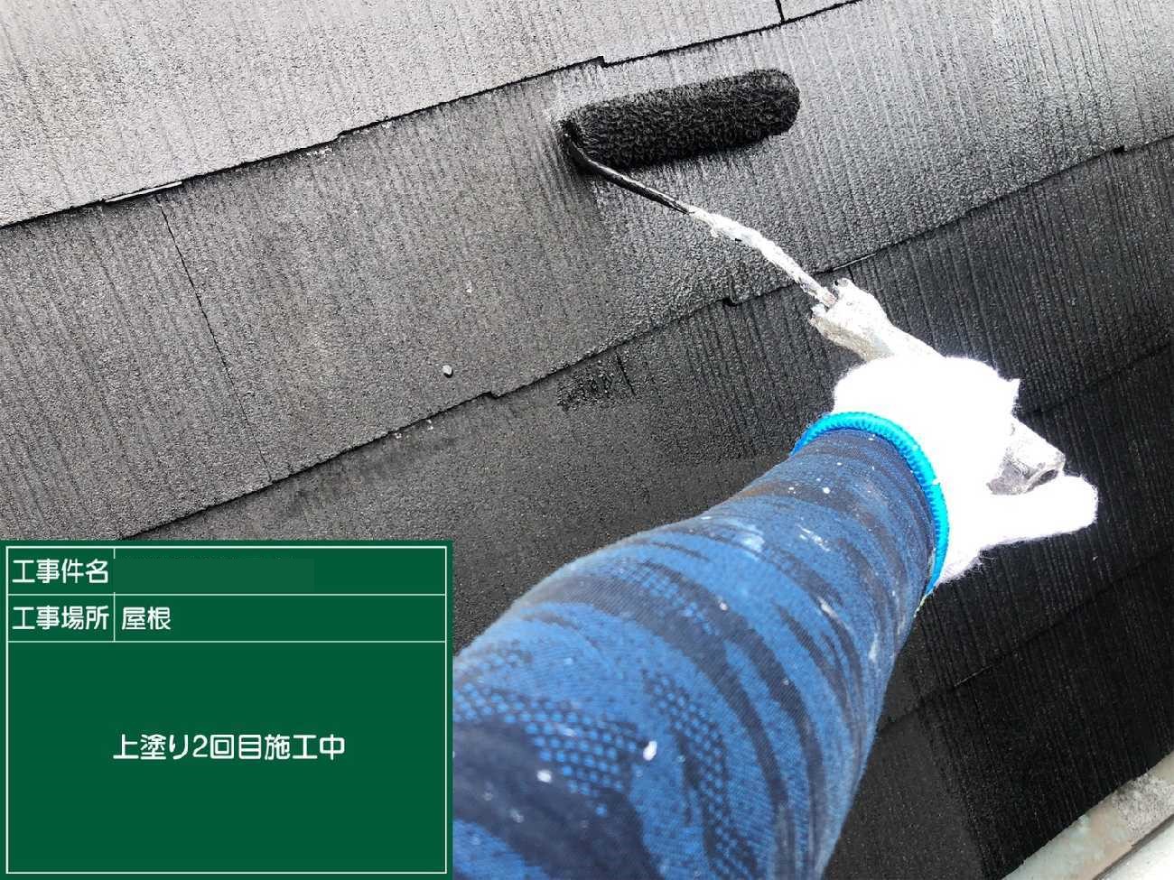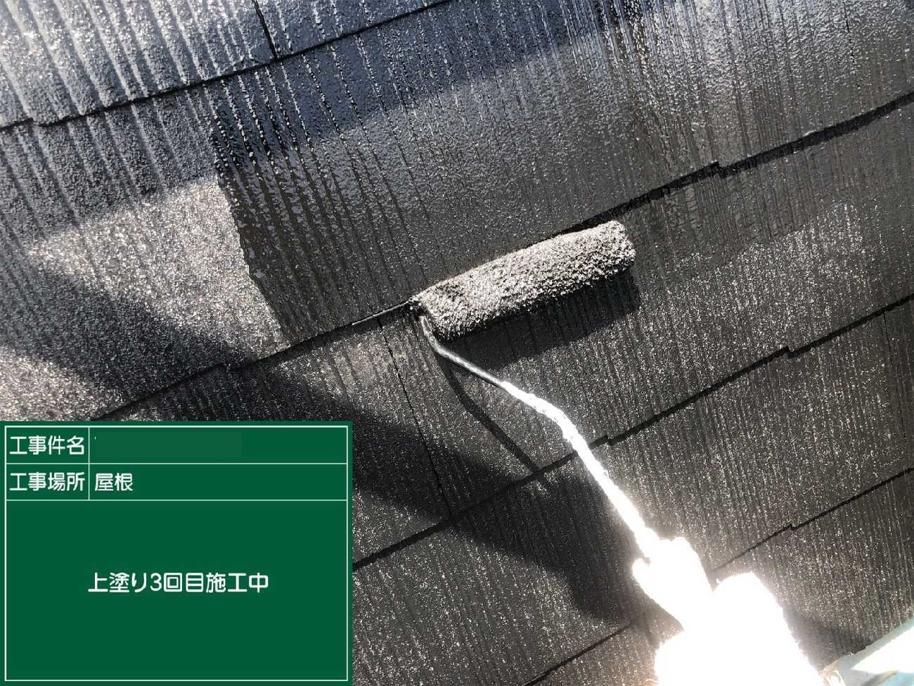 上塗り2回目。左側の瓦が白っぽいのが見えますか?光の具合もありますが、劣化が進み塗料を沢山吸ってしまっています。そのため2回塗りでは適切な塗膜の厚みが出なかったので、上塗りをさらに1工程加えたのです。