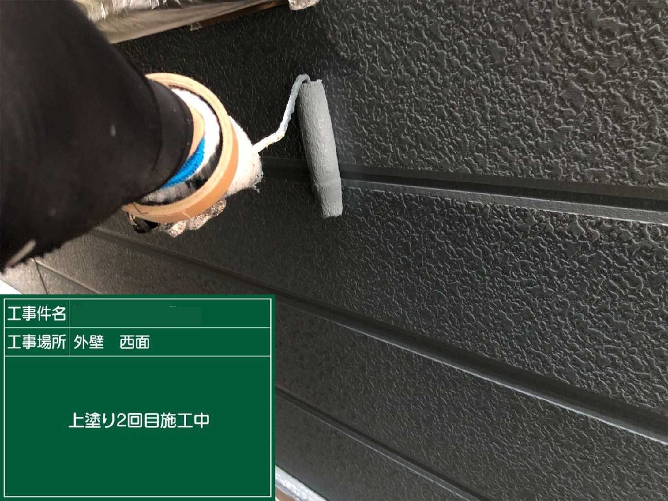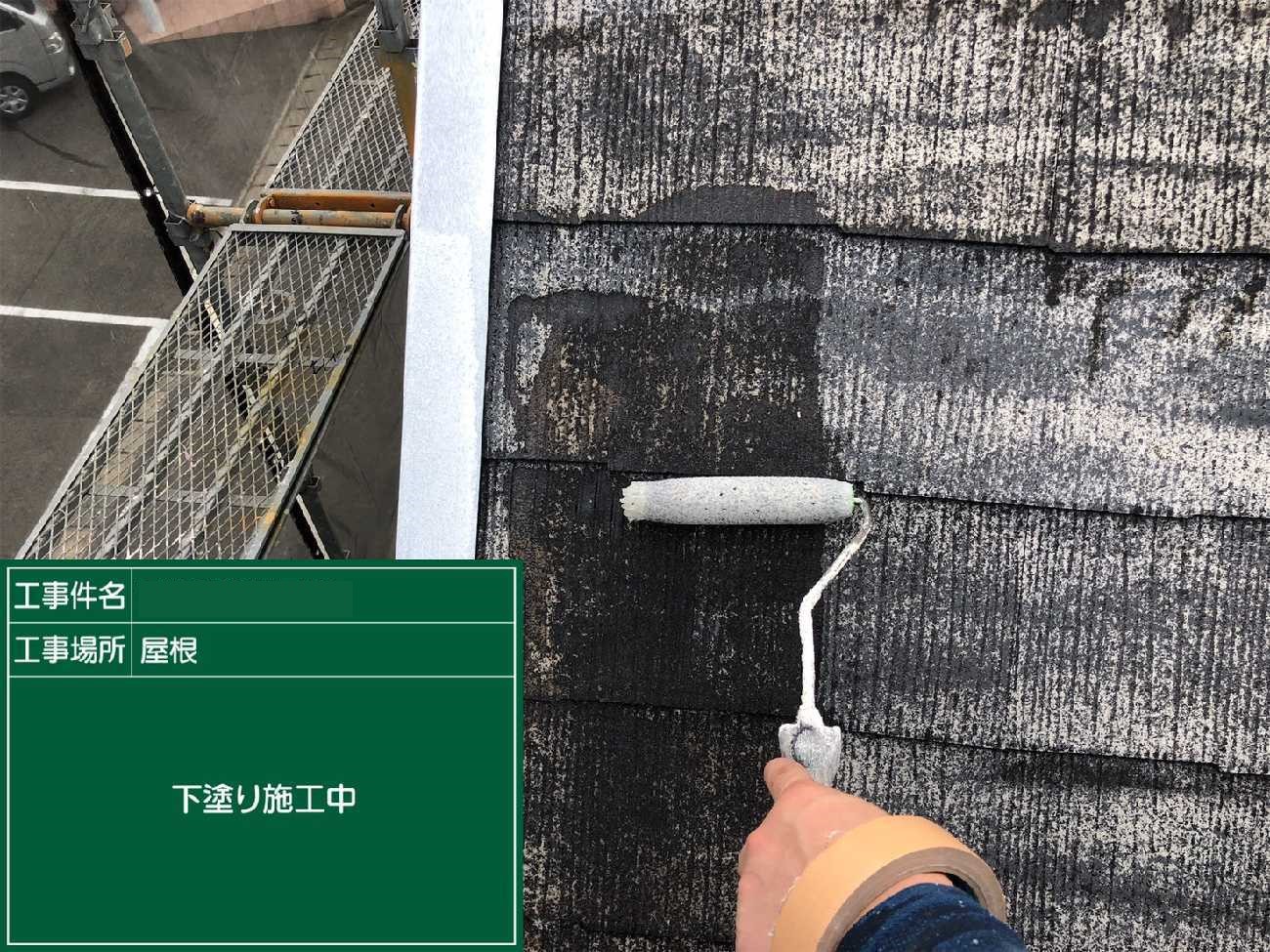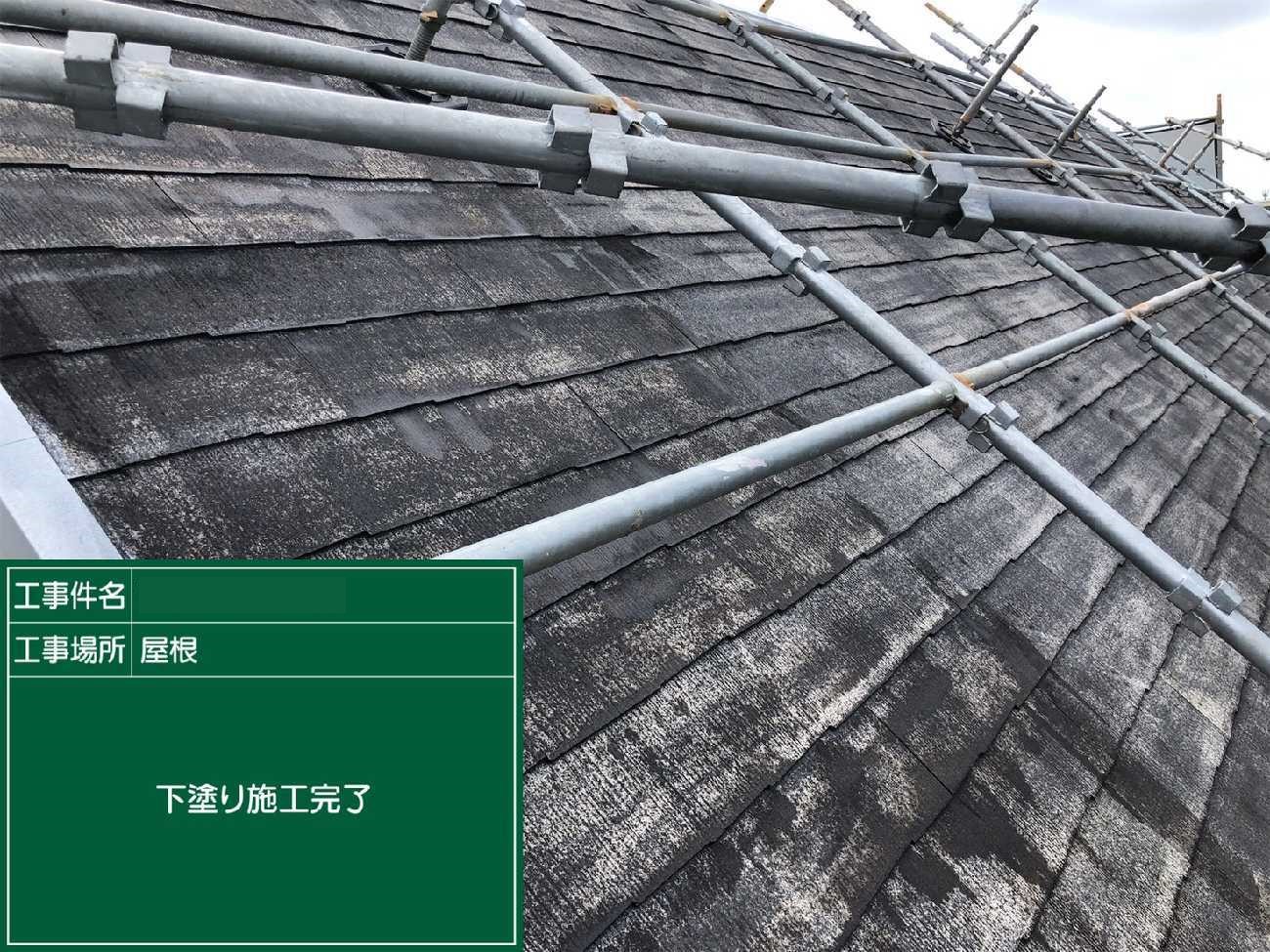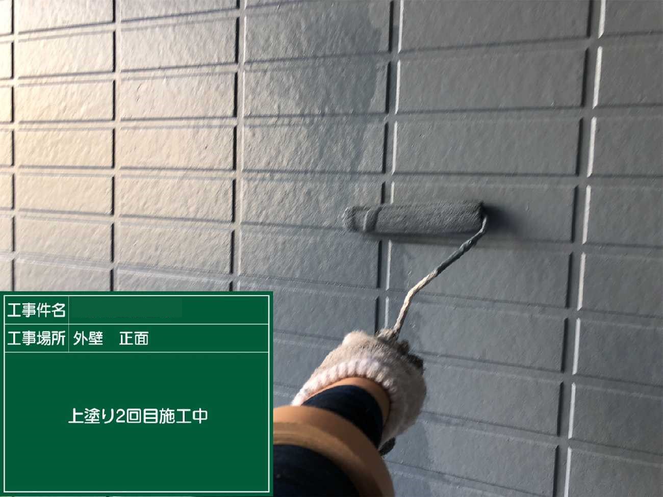 上塗り2回目。左側の瓦が白っぽいのが見えますか?光の具合もありますが、劣化が進み塗料を沢山吸ってしまっています。そのため2回塗りでは適切な塗膜の厚みが出なかったので、上塗りをさらに1工程加えたのです。