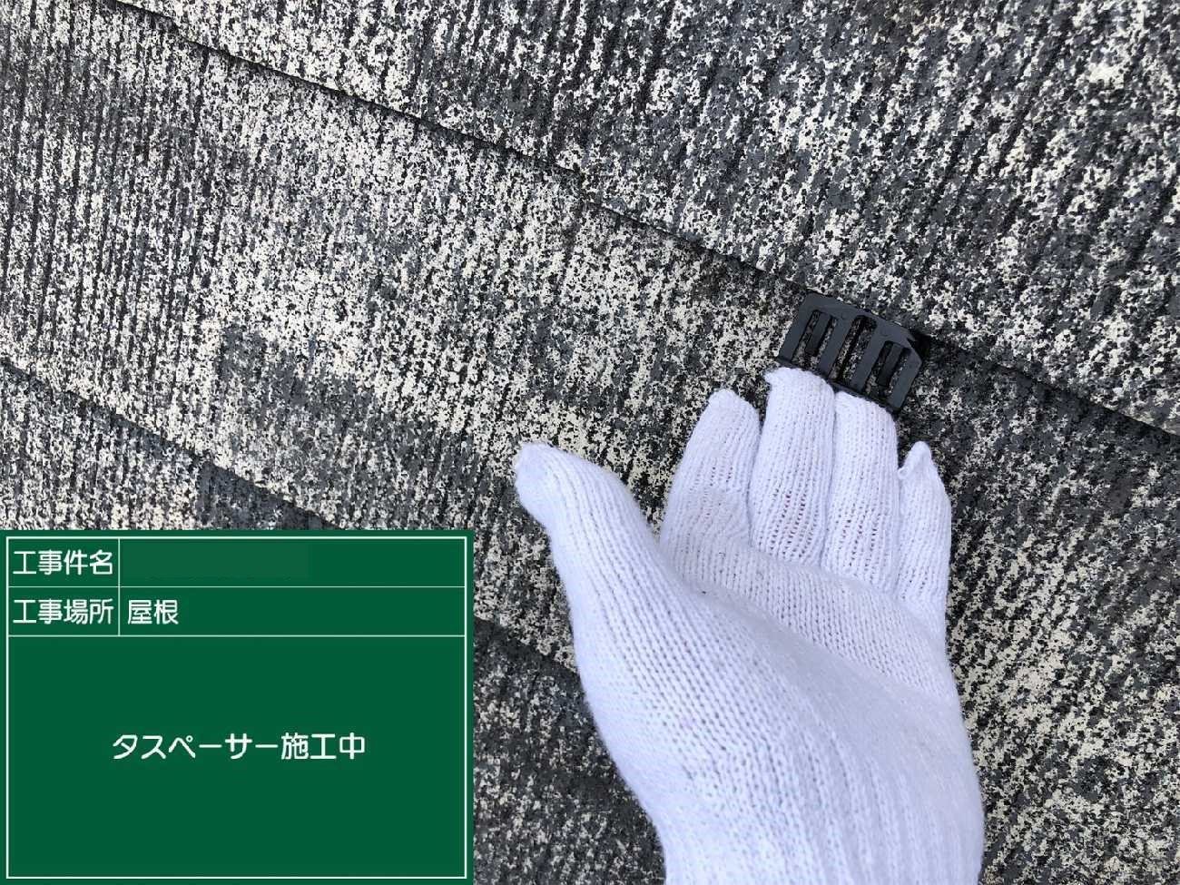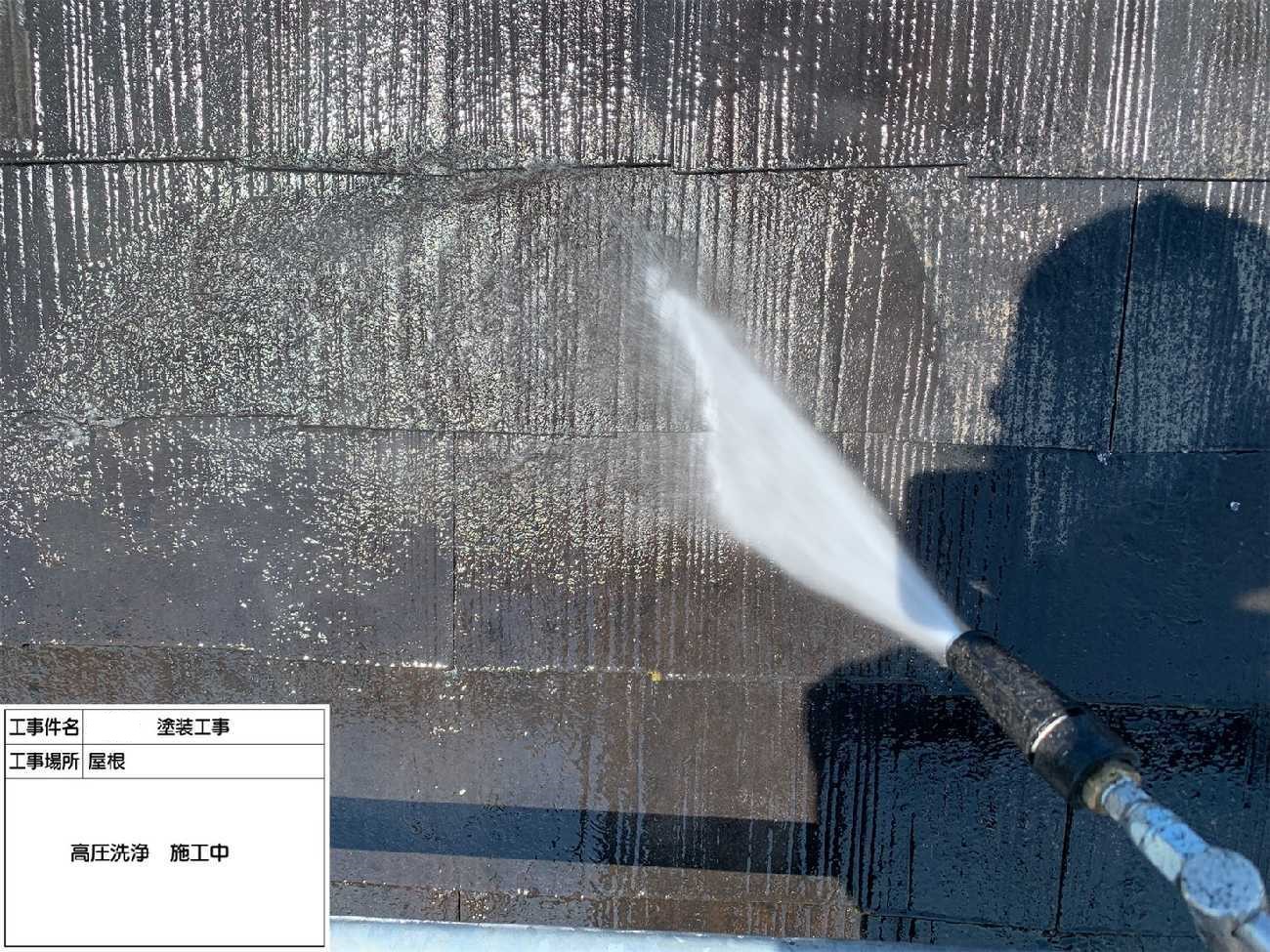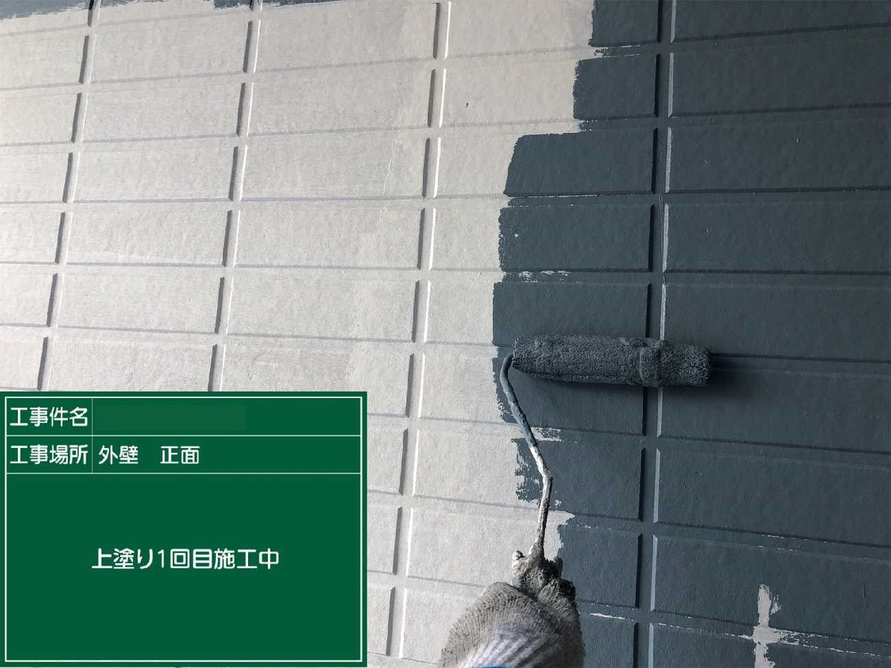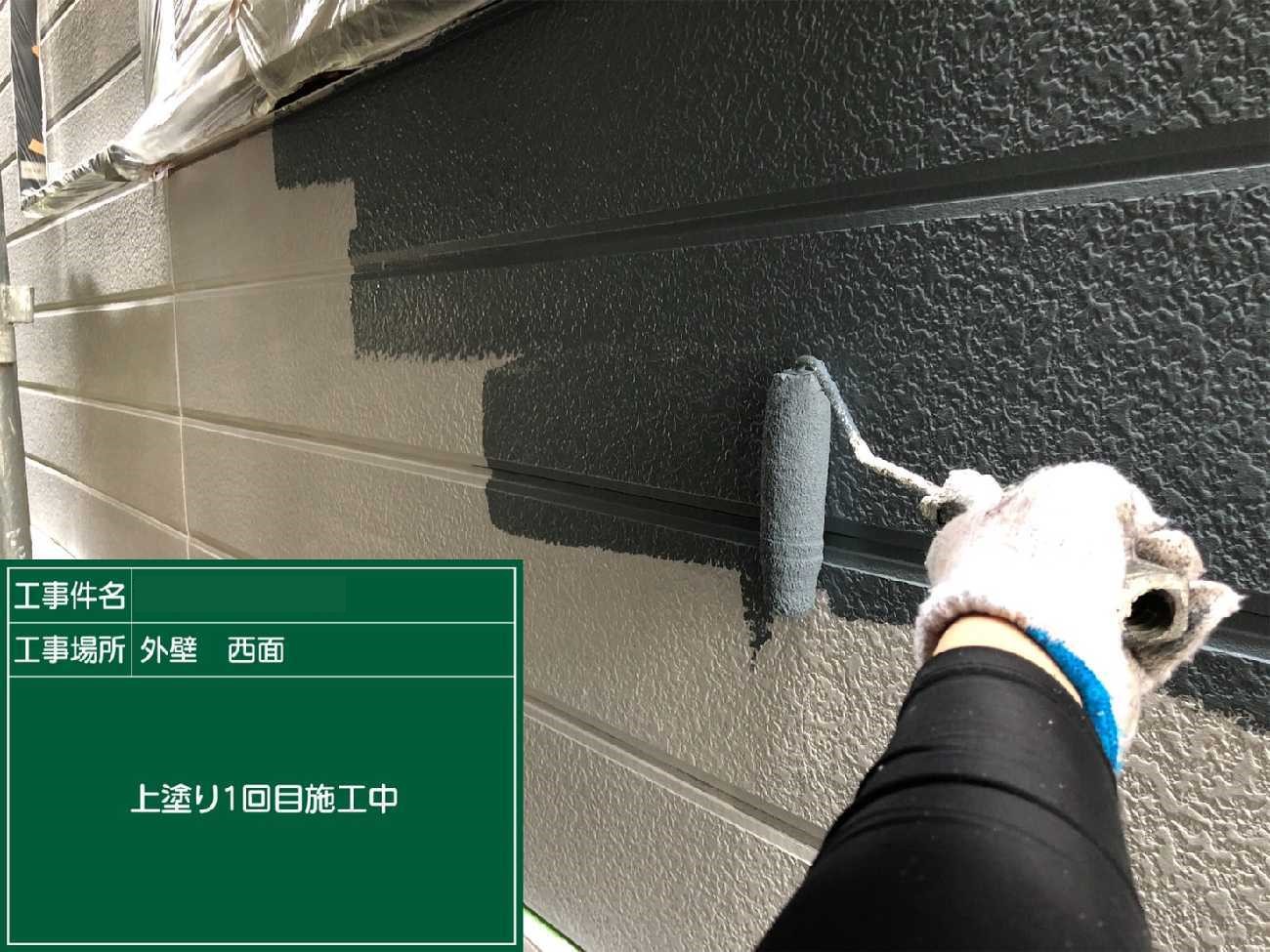 上塗り2回目。左側の瓦が白っぽいのが見えますか?光の具合もありますが、劣化が進み塗料を沢山吸ってしまっています。そのため2回塗りでは適切な塗膜の厚みが出なかったので、上塗りをさらに1工程加えたのです。