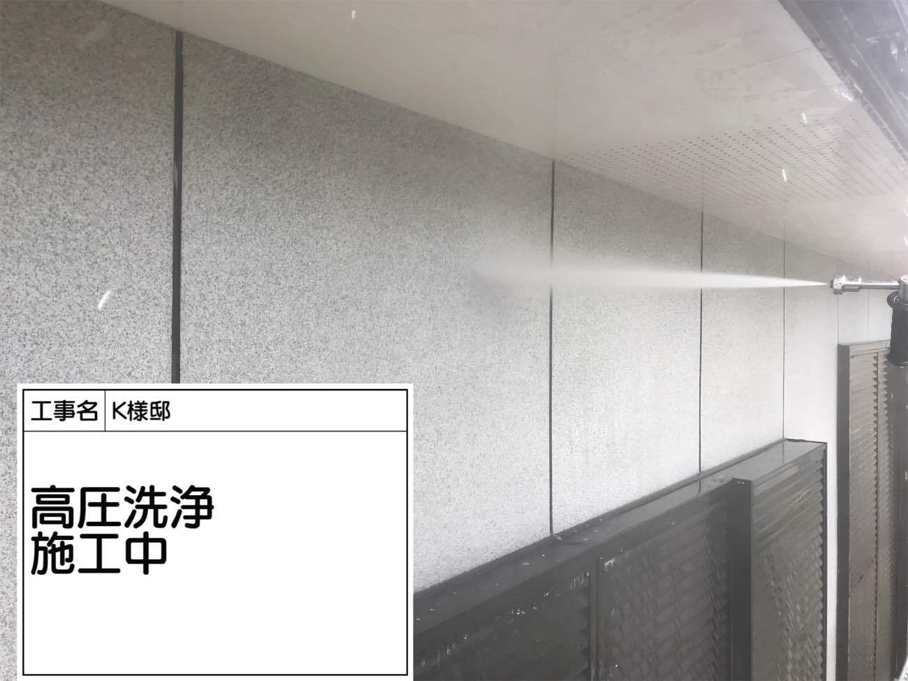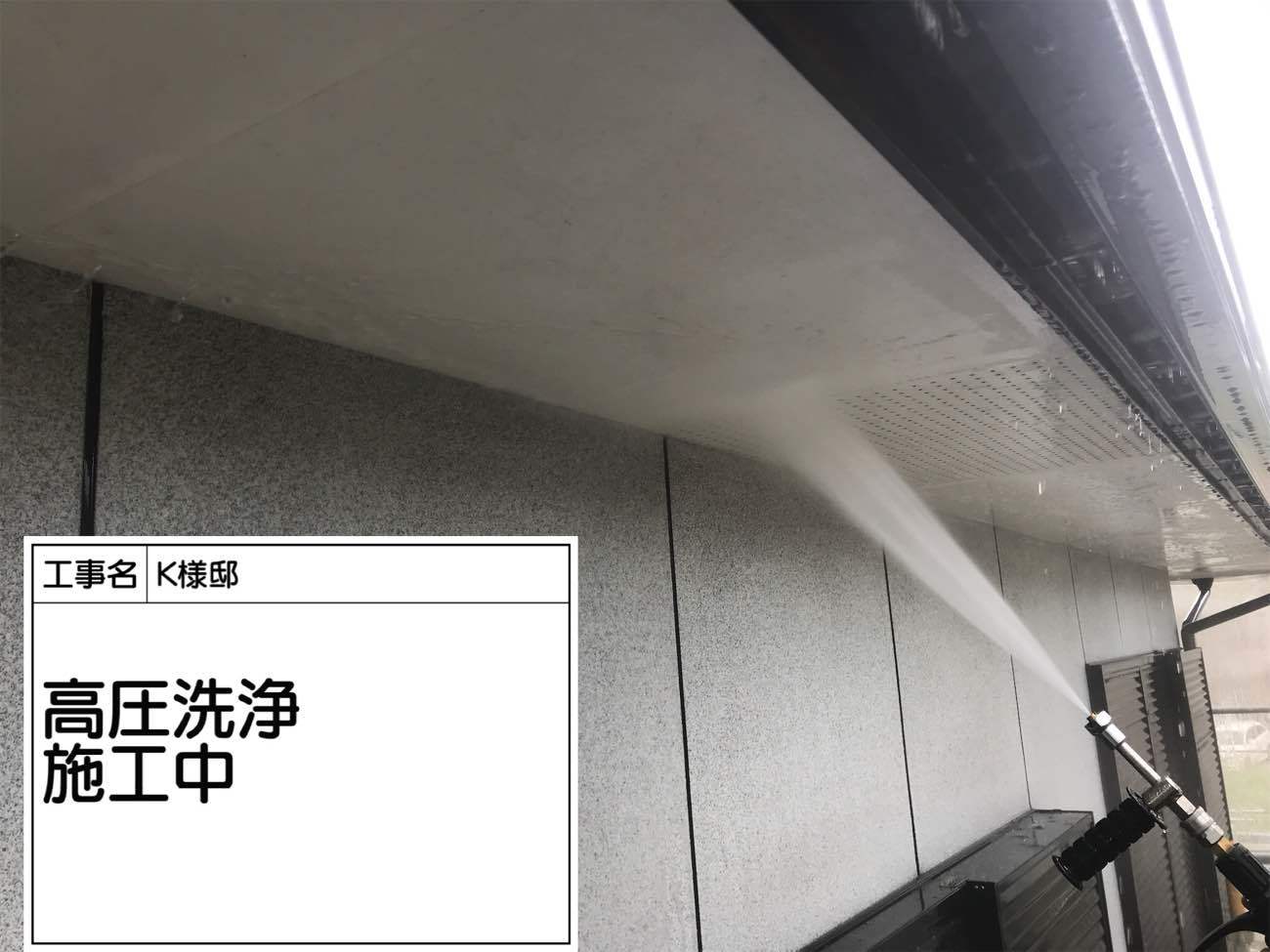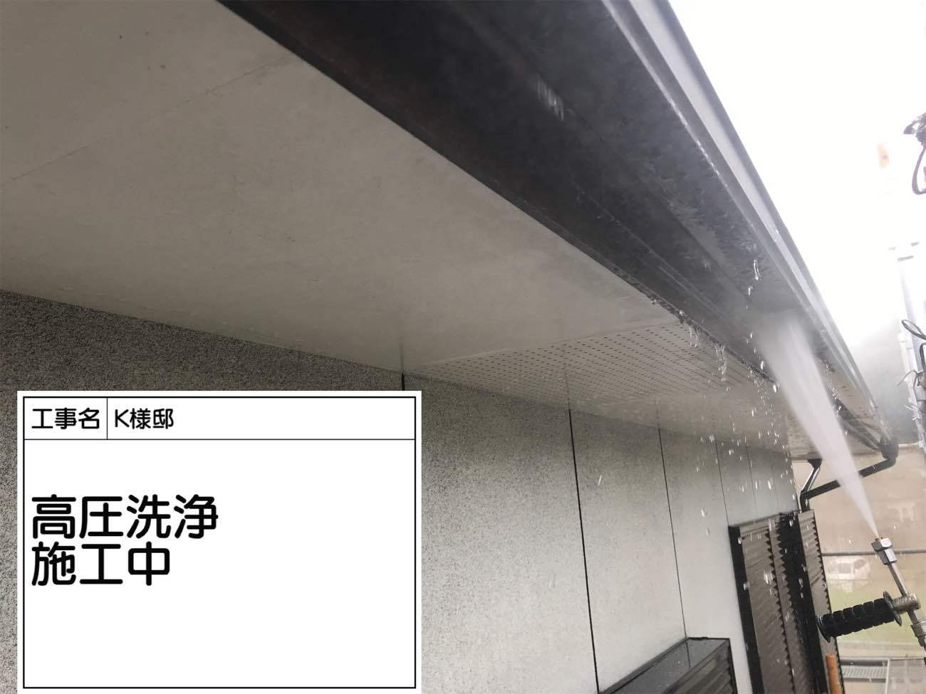 軒天も付帯部の一部。このように塗装箇所は全て高圧洗浄にて汚れなどを落としていきます。