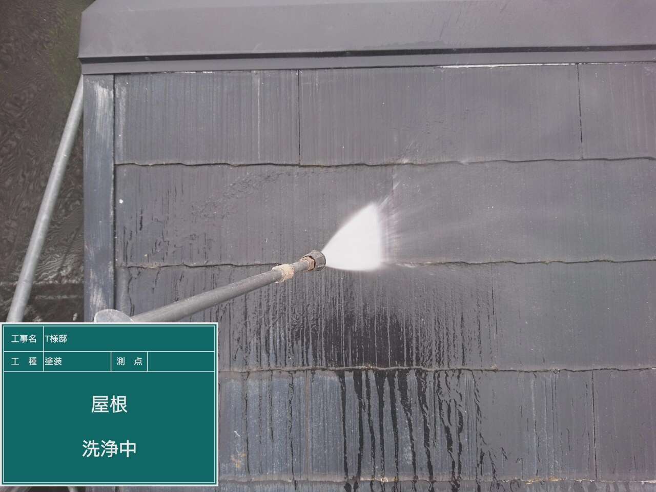 強力な高圧洗浄機で屋根の汚れなどを洗い流していきます。