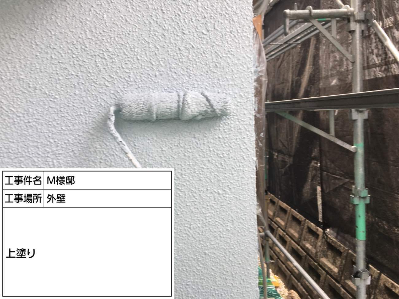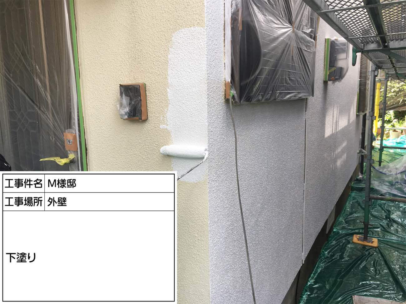 外壁の下塗り作業で中塗り塗料との密着度を高めます。