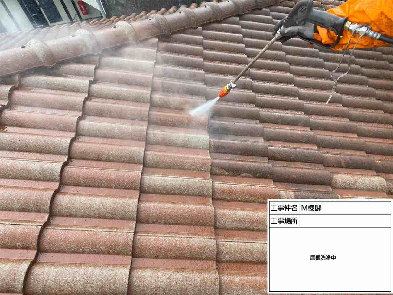 強力な高圧洗浄機で屋根の汚れなどを洗い流していきます。