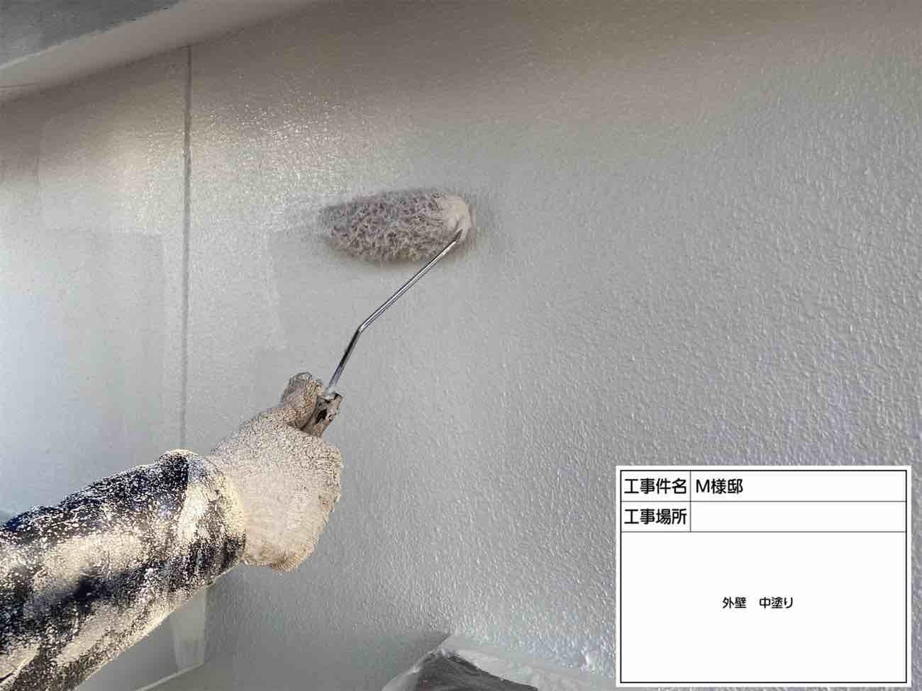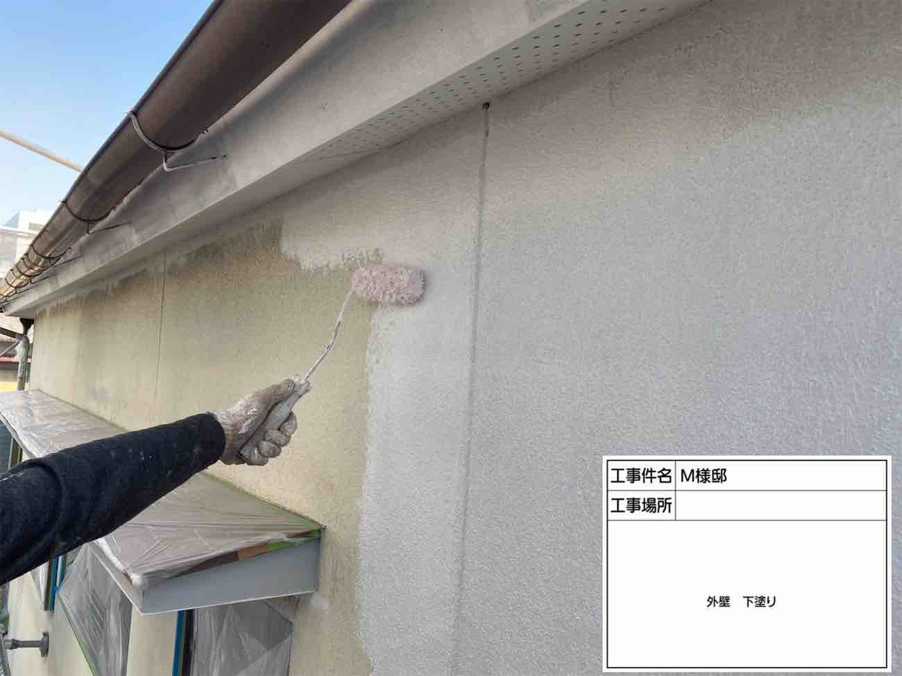 外壁の下塗り作業で中塗り塗料との密着度を高めます。 この工程で手を抜くと塗膜が剥がれる原因となりますので注意が必要です。