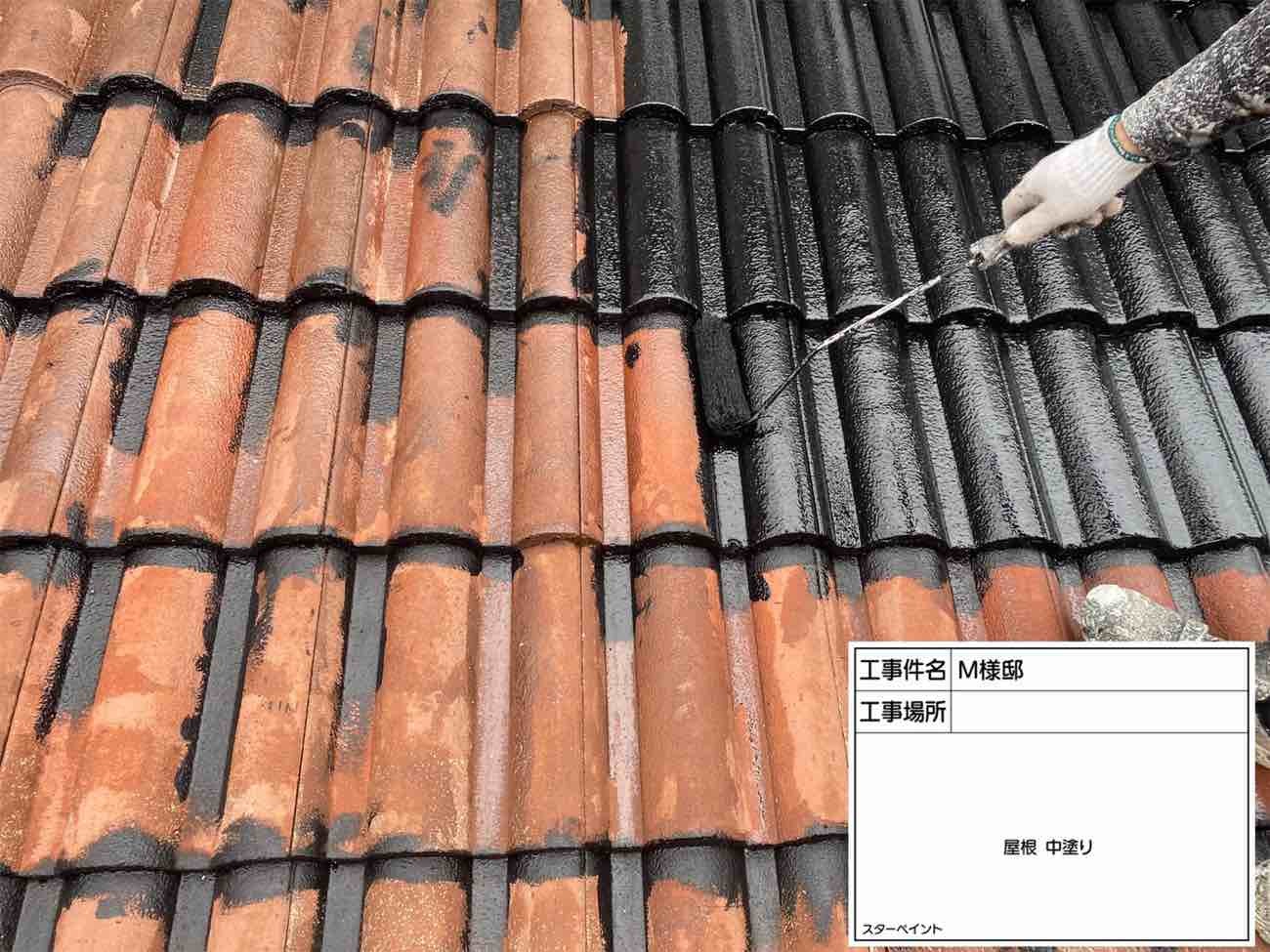 上塗り作業で塗膜の耐候性を高めます。直射日光の影響も出やすいお屋根、高耐候の塗料がお勧めです。