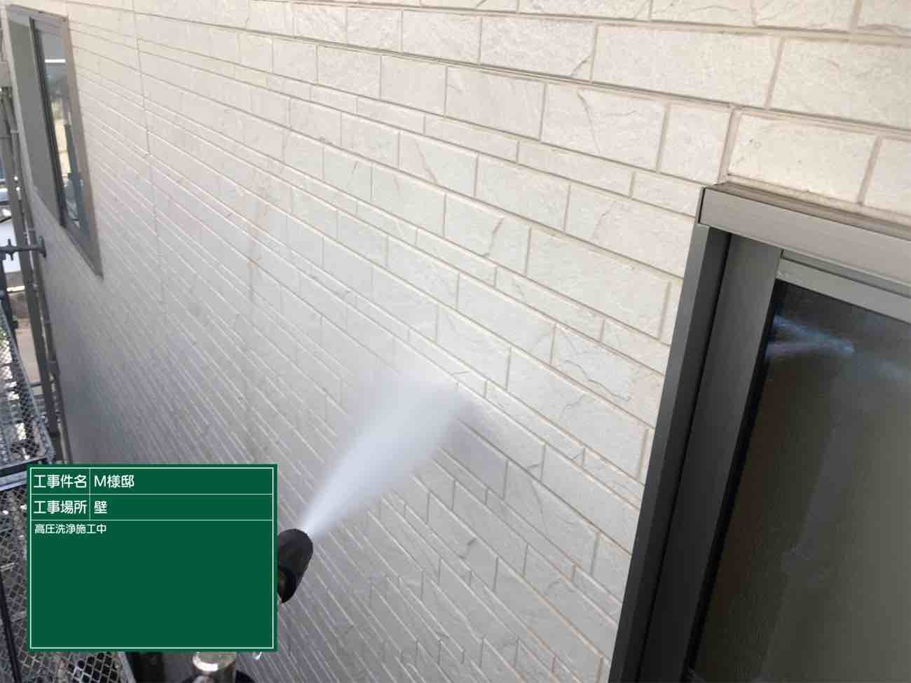 外壁の汚れを高圧洗浄で洗い流していきます。