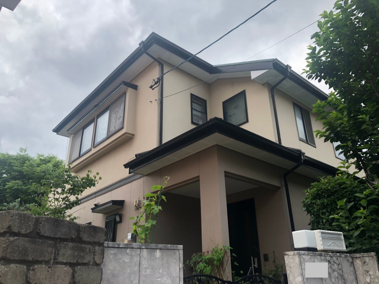スクエアな形状が非常に綺麗なお宅でしたので、そのシルエットを強調する配色をご提案しました。窓枠の黒に合わせて濃色を配置したことで、全体に統一感が生まれています。...