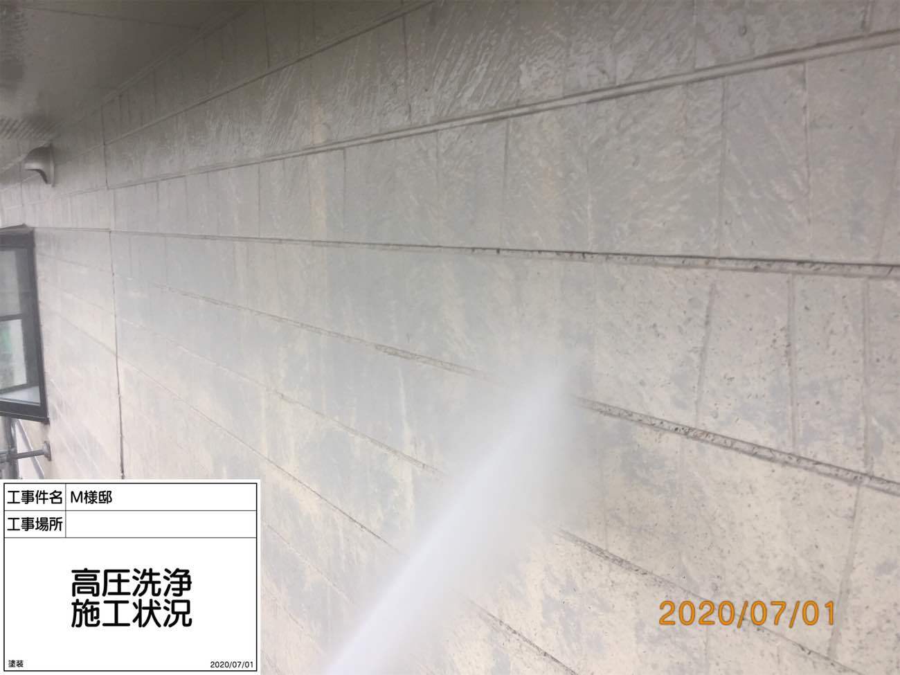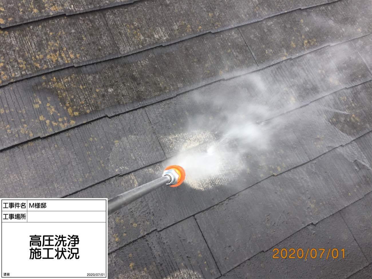 まずは高圧洗浄。黄色っぽく見えるのはコケ。できる限りしっかり落としていきます。
