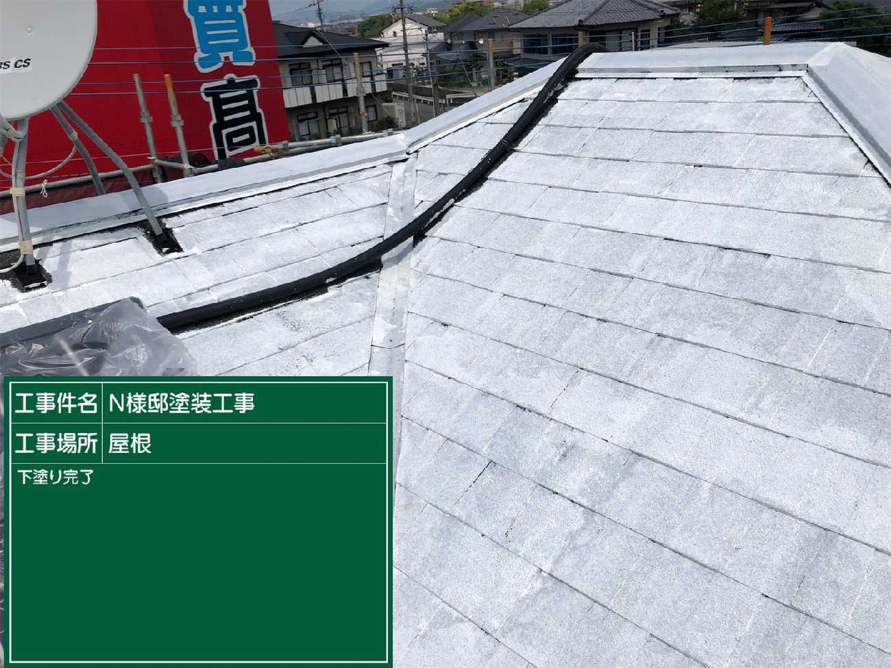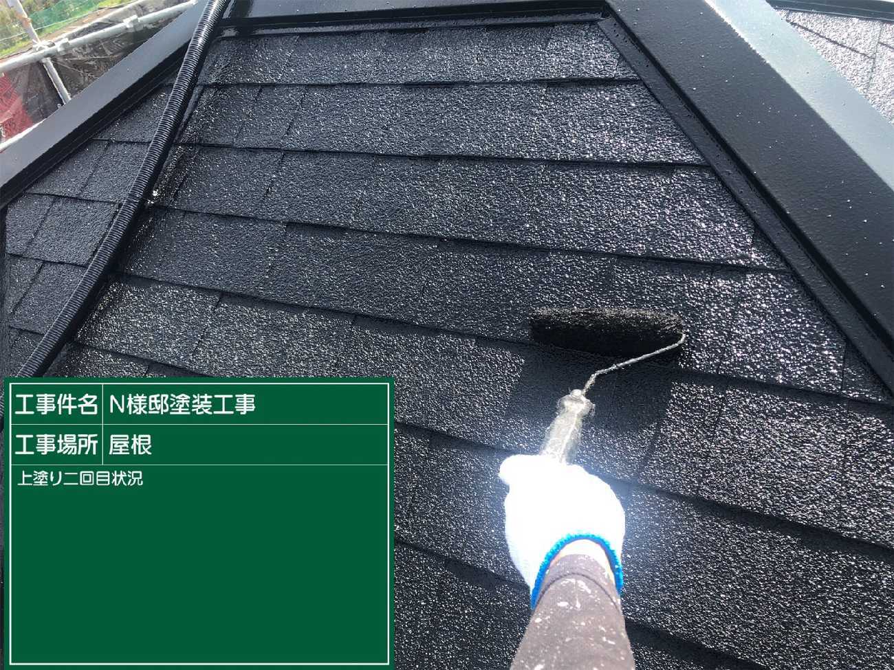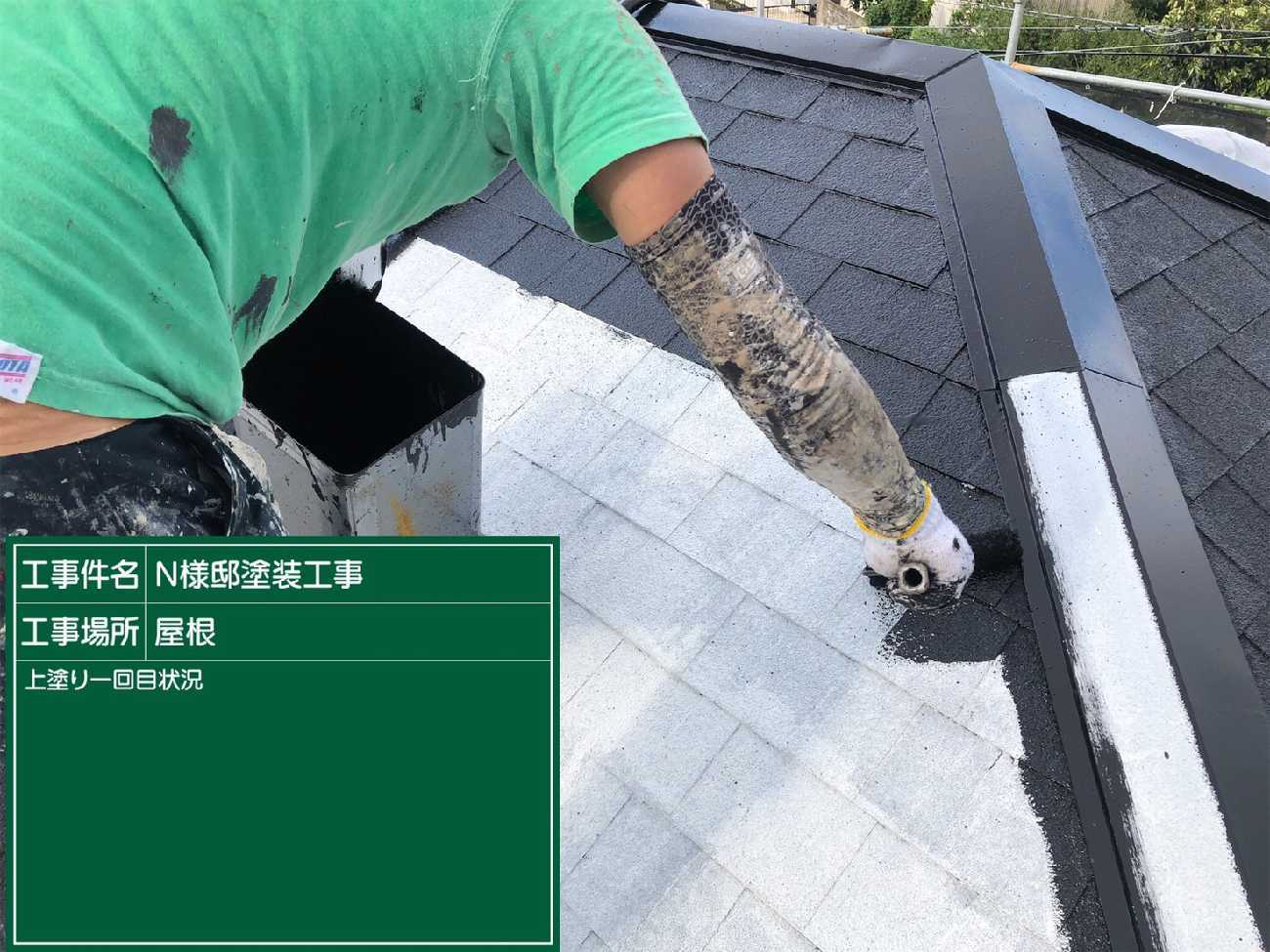 アスファルトシングルに適した下塗り材を塗布していきます。通常は透明の下塗り材を塗ることが多いのですが、今回は白。色が透けやすいのでこの後の中、上塗りをより丁寧に行っていく必要があります。