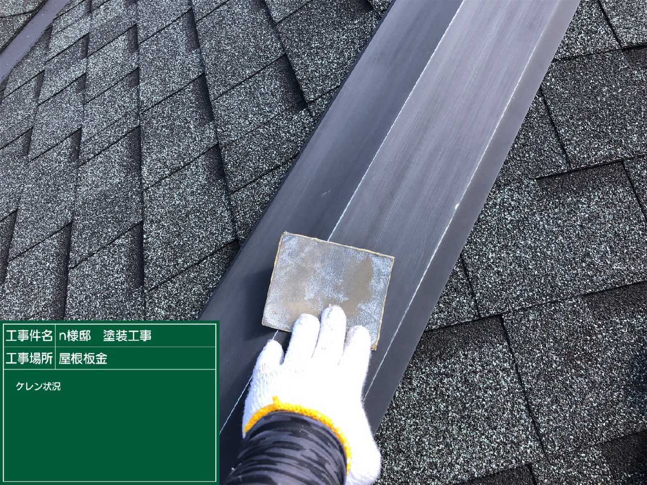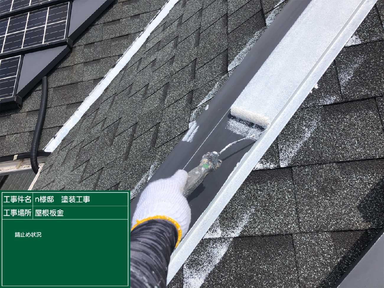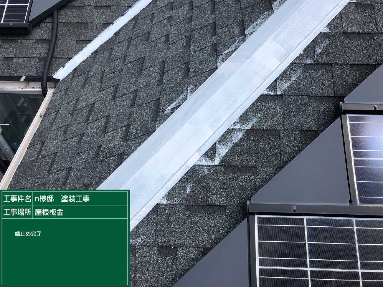 アスファルトシングルに適した下塗り材を塗布していきます。通常は透明の下塗り材を塗ることが多いのですが、今回は白。色が透けやすいのでこの後の中、上塗りをより丁寧に行っていく必要があります。