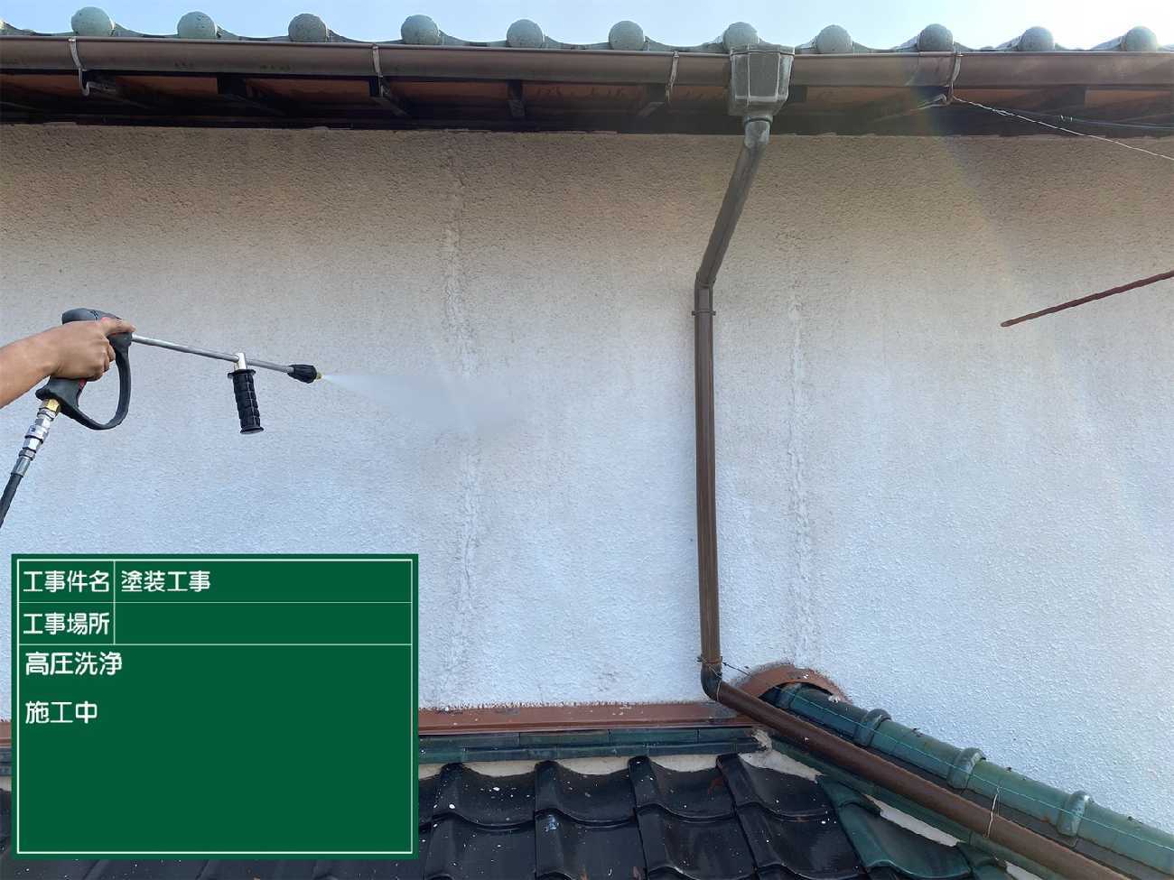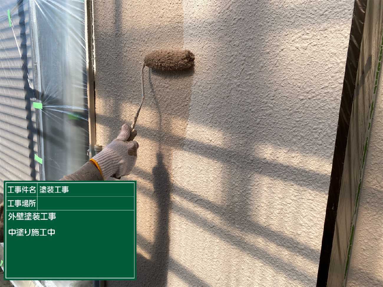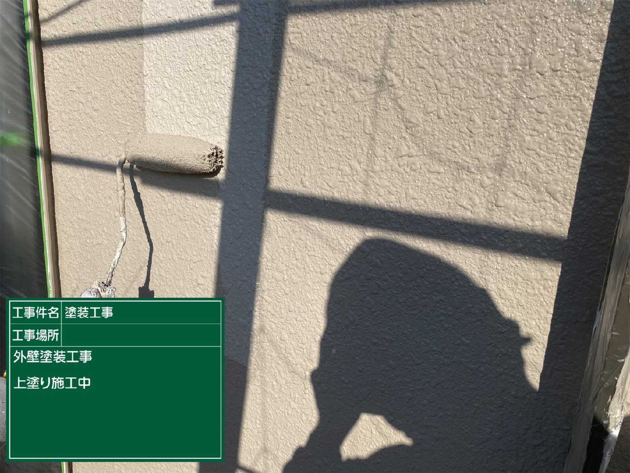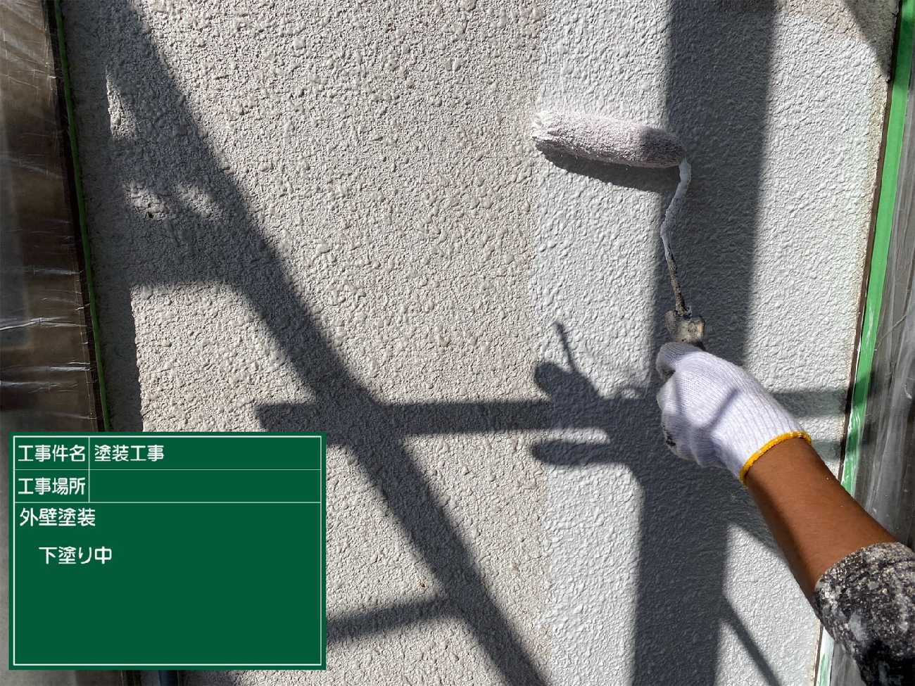 外壁の下塗りの様子です。外壁塗装工事を行う場合の工程として下塗り・中塗り・上塗りとあります。