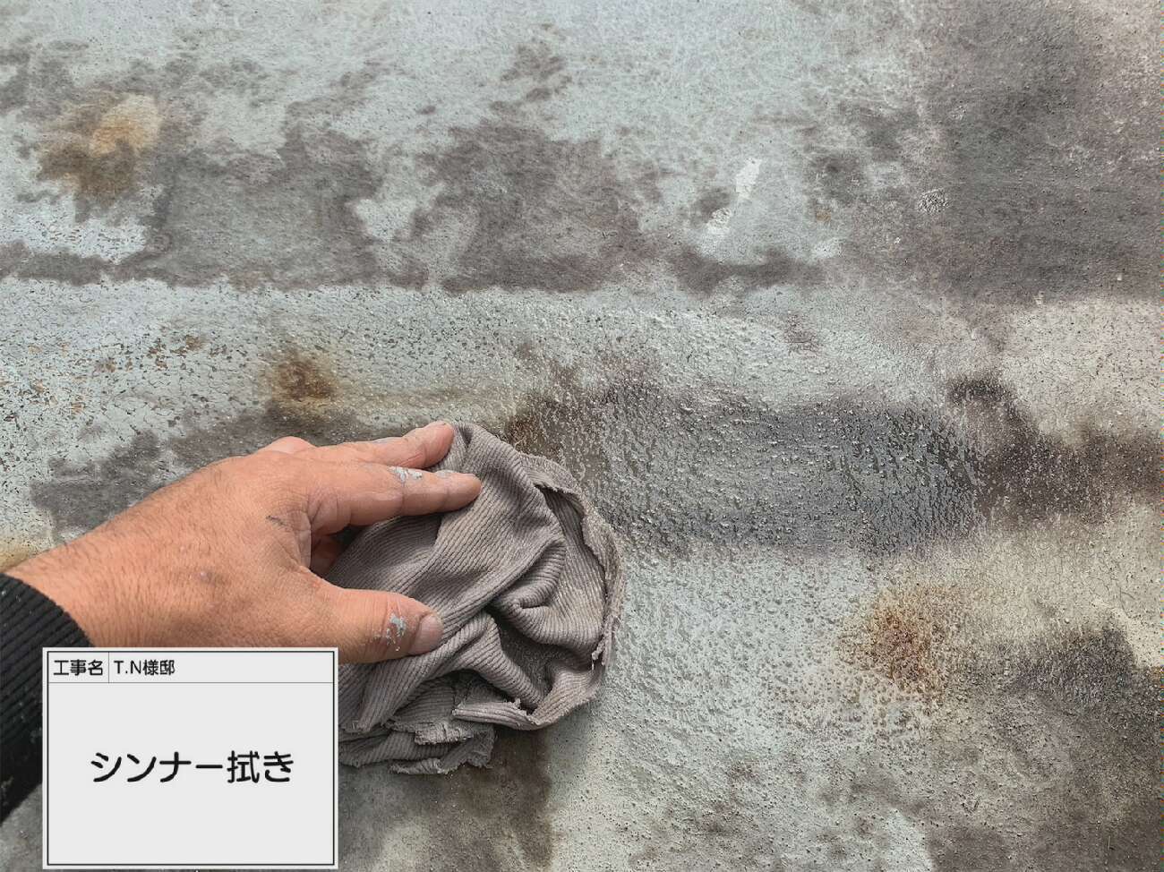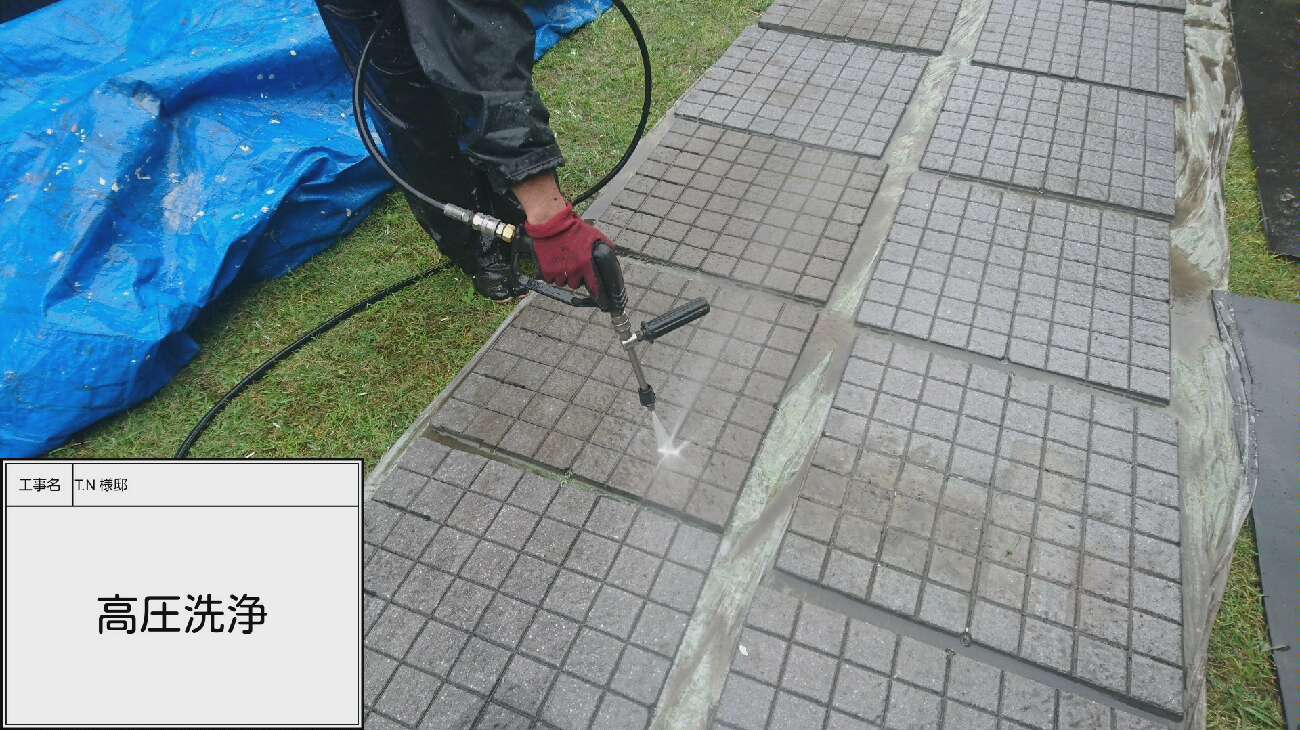 コケや汚れ、チョーキングによって発生した表面の粉などを取り除いていきます。