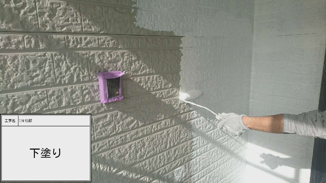 外壁の下塗りは白色の塗料を使用します。どんな色を載せても綺麗に発色し塗料の密着を高めます。