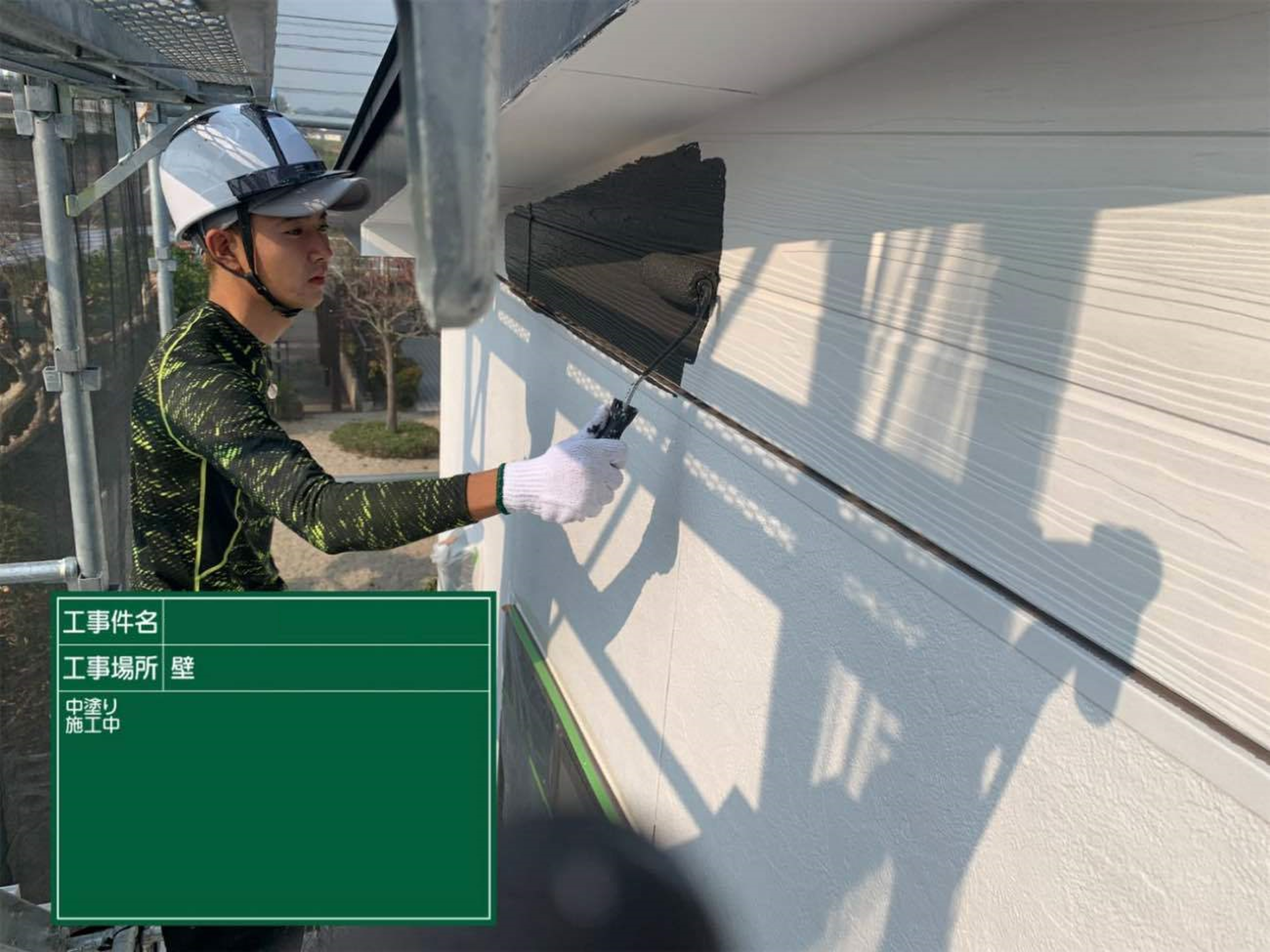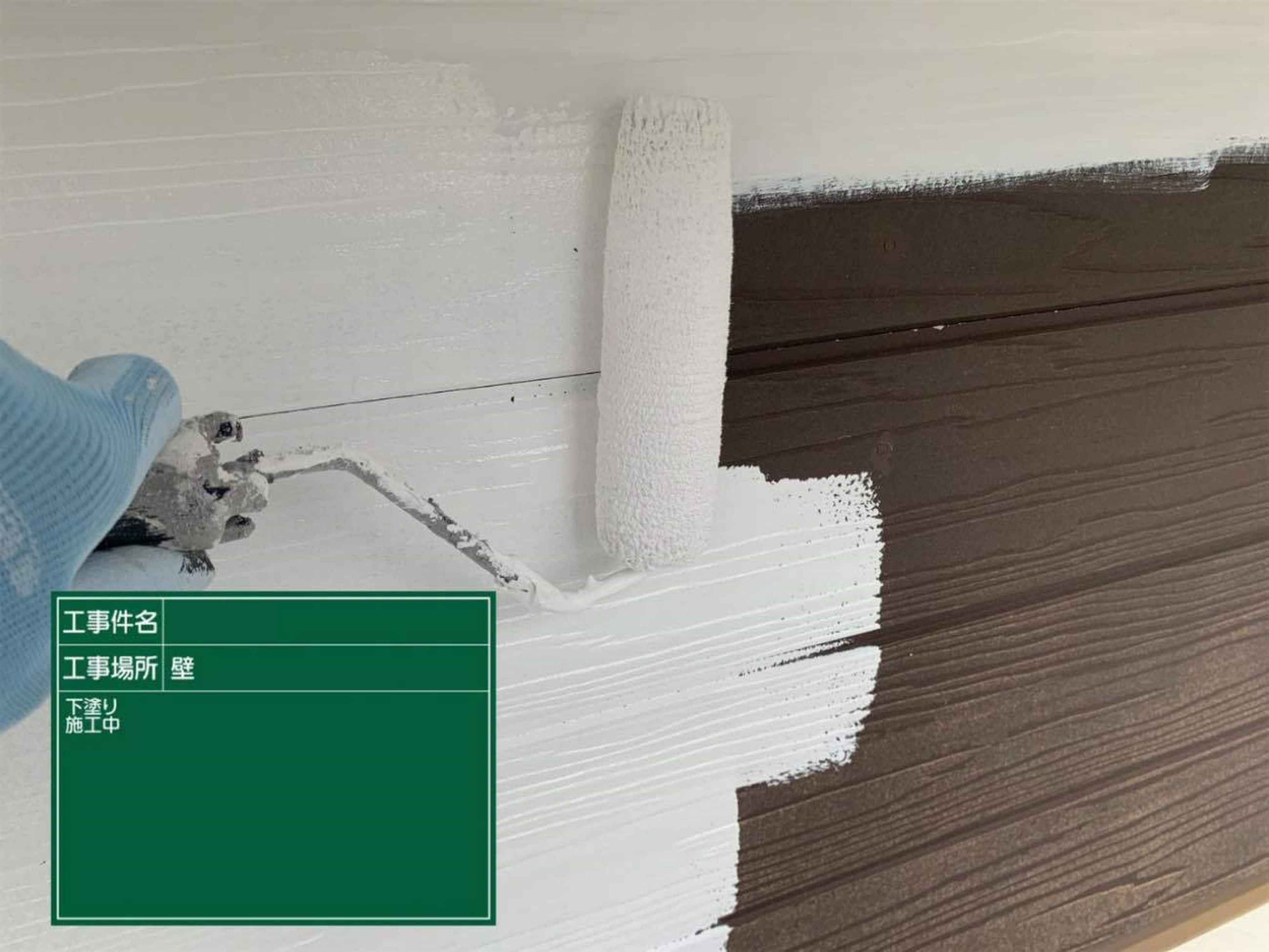 今回外壁はデザインの異なる2種類のサイディングボードで色分けを行います。まずは下塗り工程です。