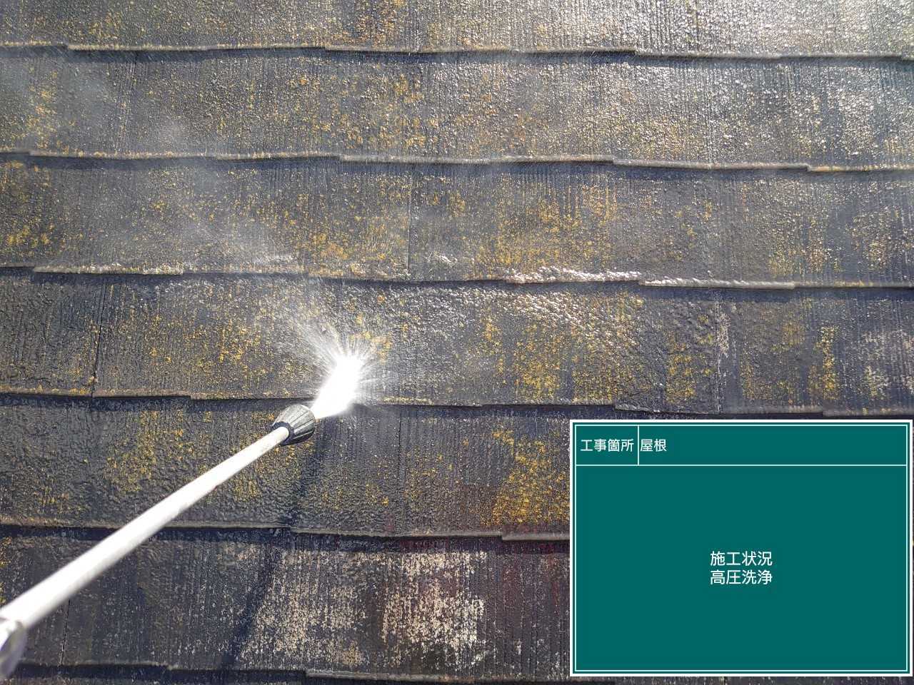 屋根の洗浄作業を行います。 コケなどが生えている場所を確り洗浄で落としていきます。
