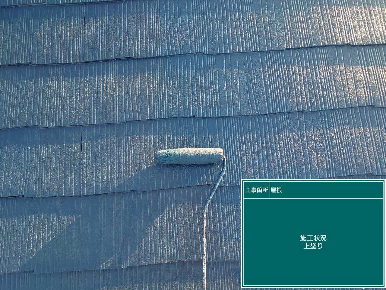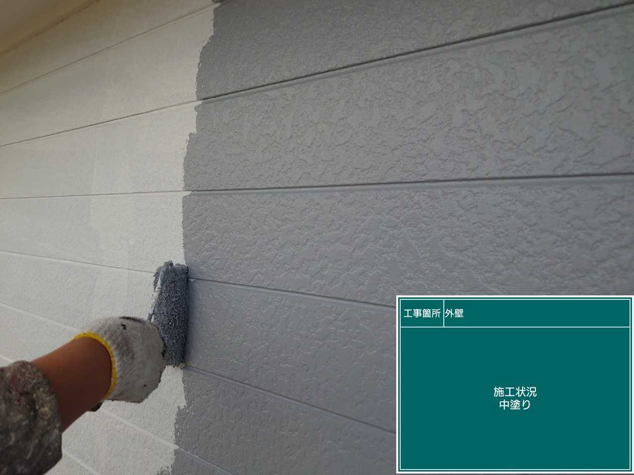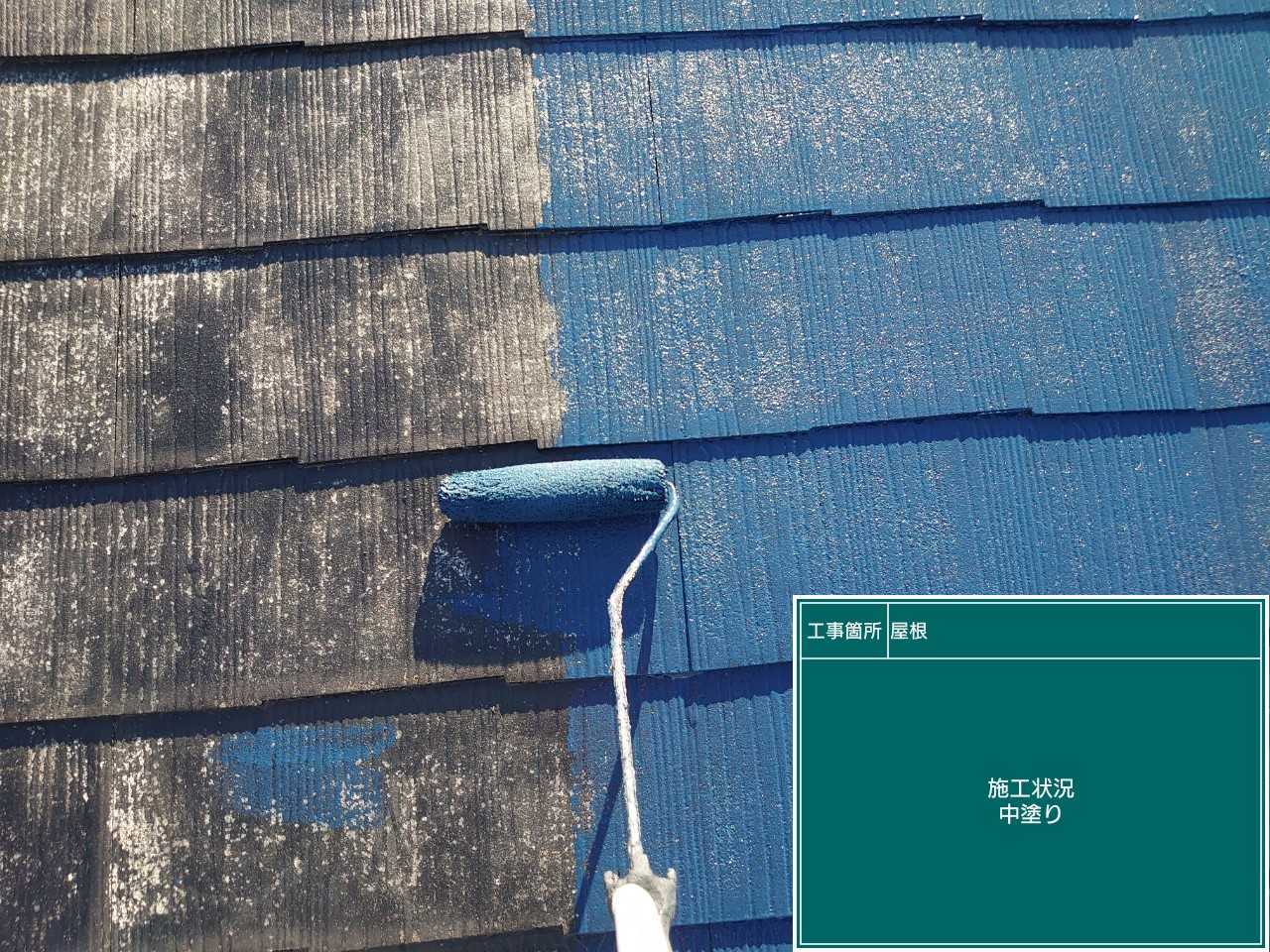 中塗り作業です。外壁も屋根も下塗り・中塗り・上塗りの順で塗装を行っていきます。