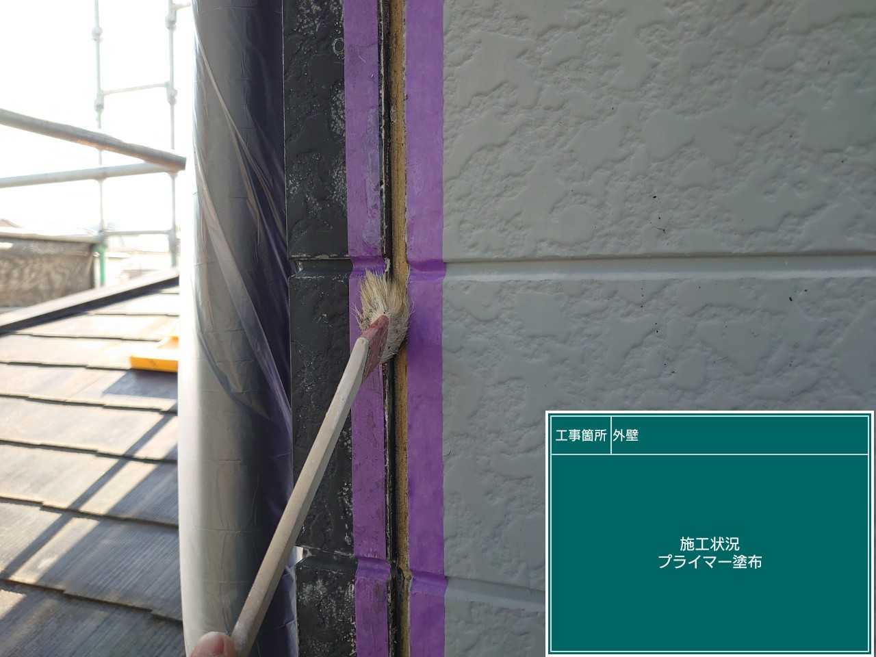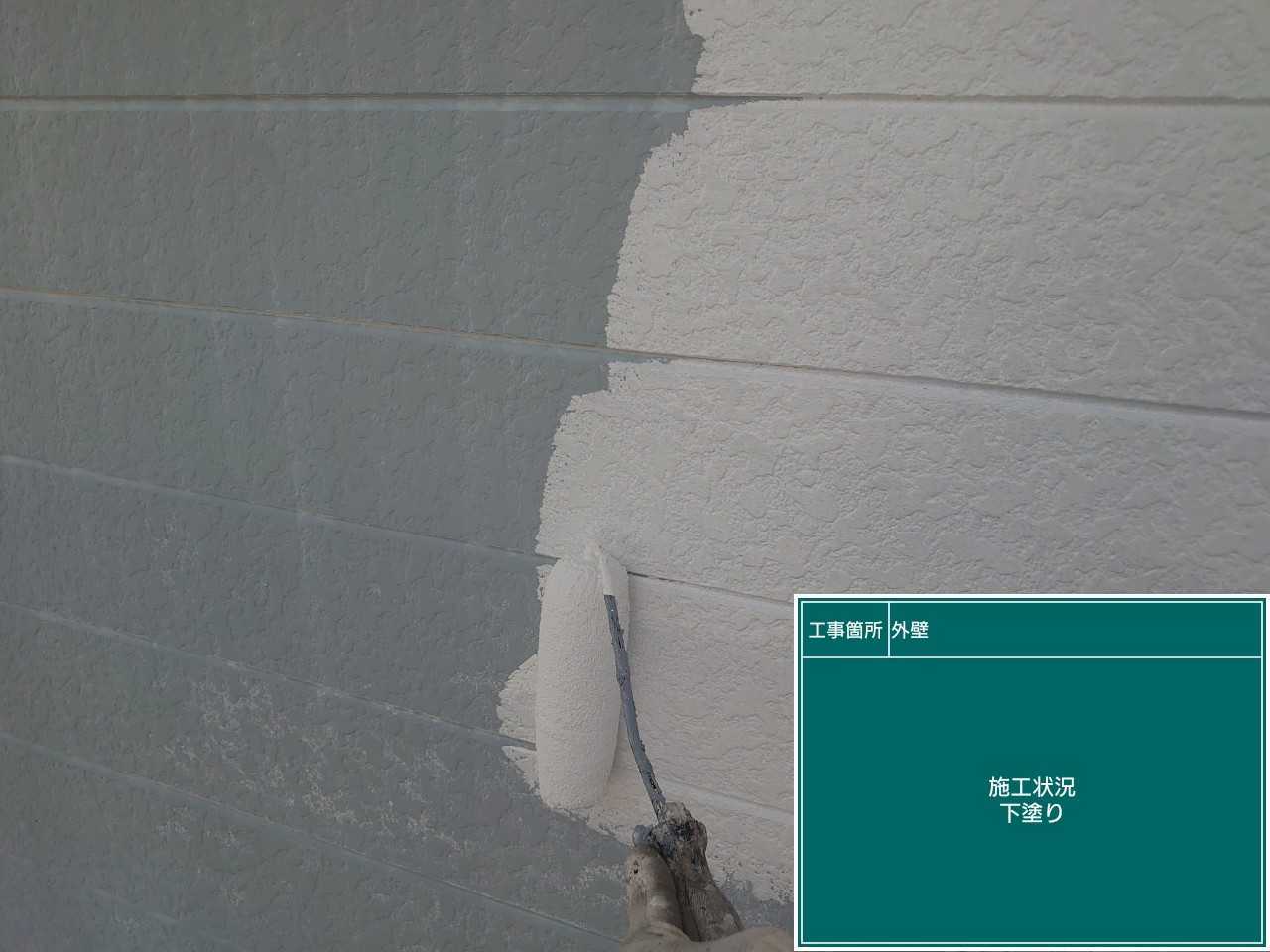 外壁の下塗り作業です。下塗りで上塗りをする塗料の密着性を高めていきます。