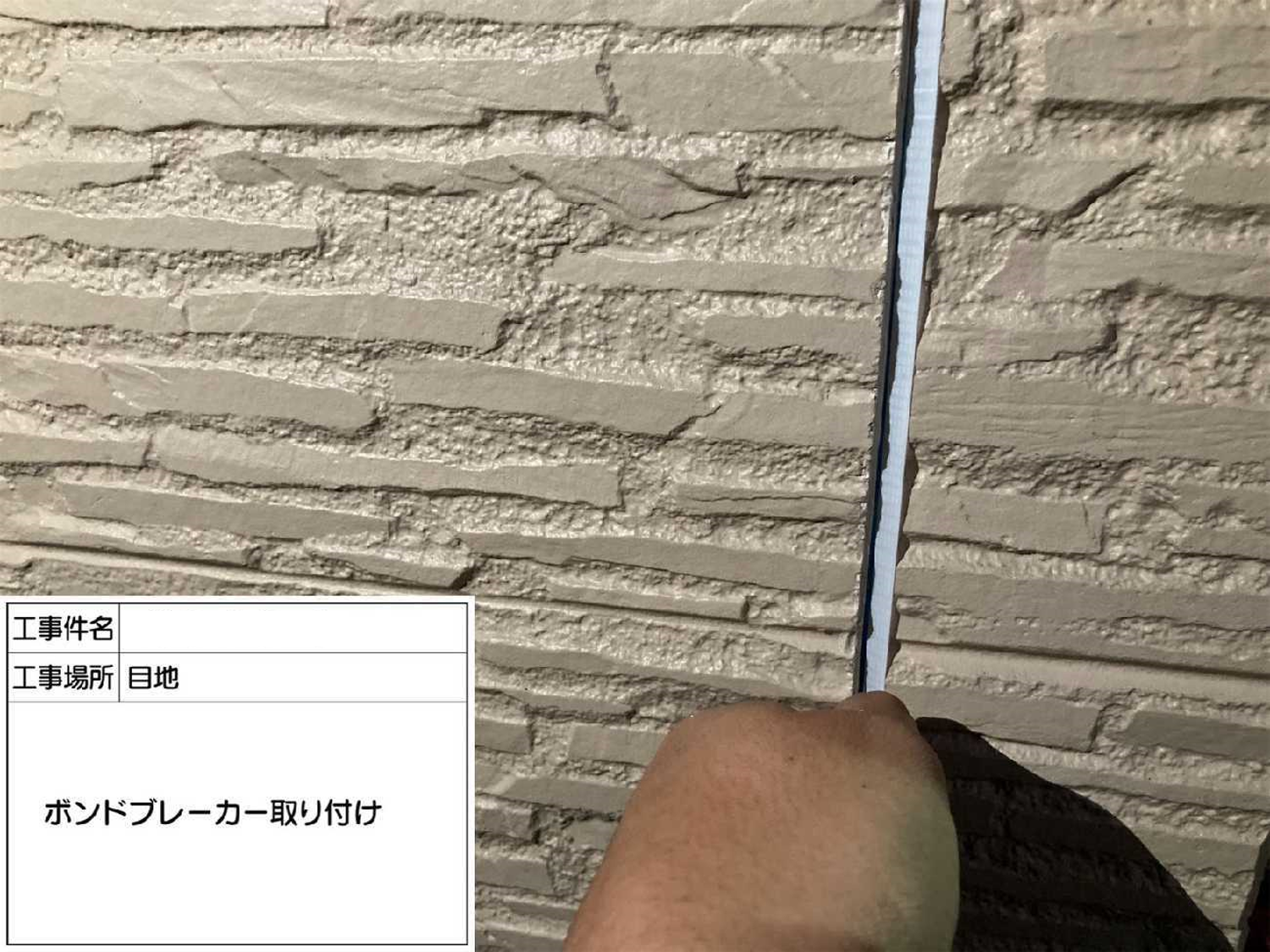 白いテープ状のものがボンドブレーカー。目地に遊びを持たせひび割れを抑止します。